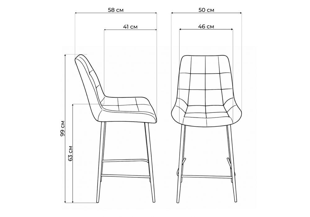 Материал каркаса - металл; Материал сиденья - велюр; Материал обивки - велюр; Ширина - 50; Глубина - 58; Высота - 99; Ширина сиденья - 46; Глубина сиденья - 41; Высота сиденья - 63;