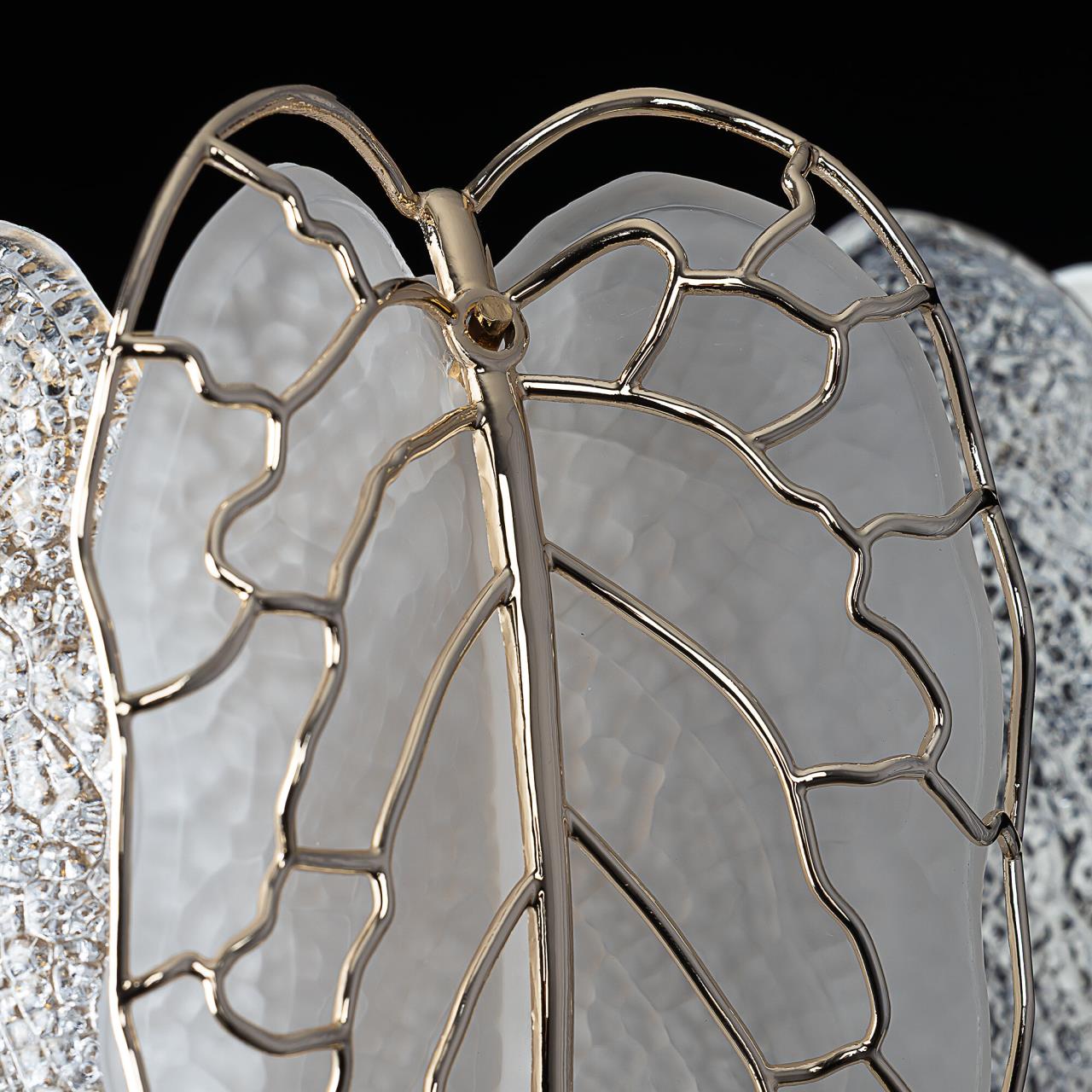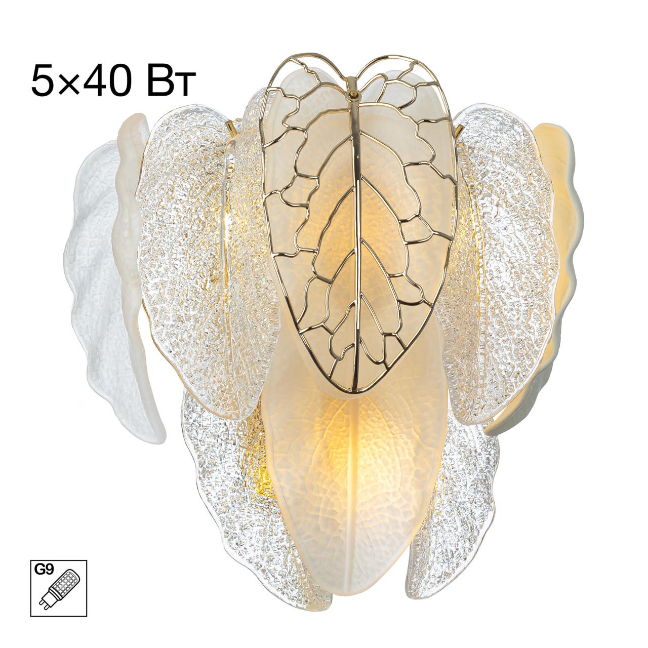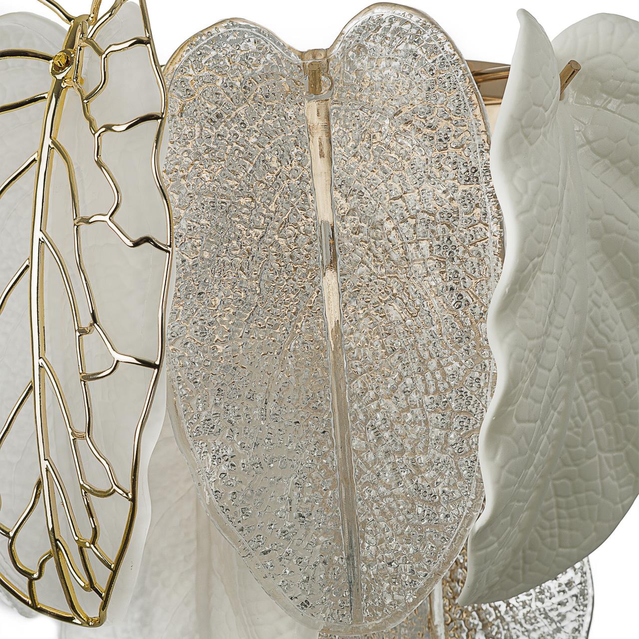 Металлический каркас золотистого оттенка переливается в лучах света, вступая в гармоничный союз с листьями из матового и прозрачного стекла и керамики. Металлические листья-подвески отлиты по ювелирной технологии, что подчёркивает изысканность и чёткость флористического рисунка. В изделии используется 5 лампочек с цоколем G9, тип крепления светильника — планка.