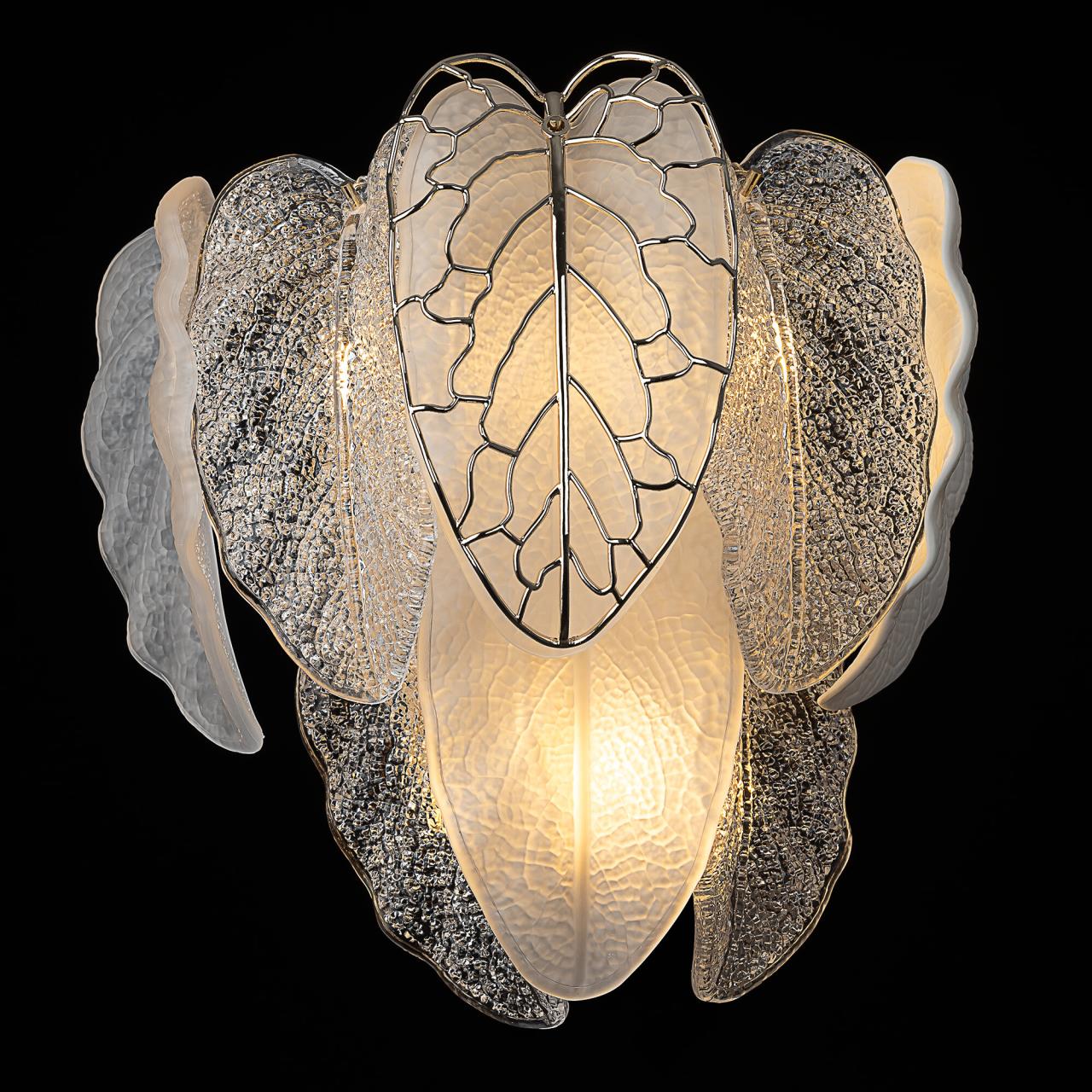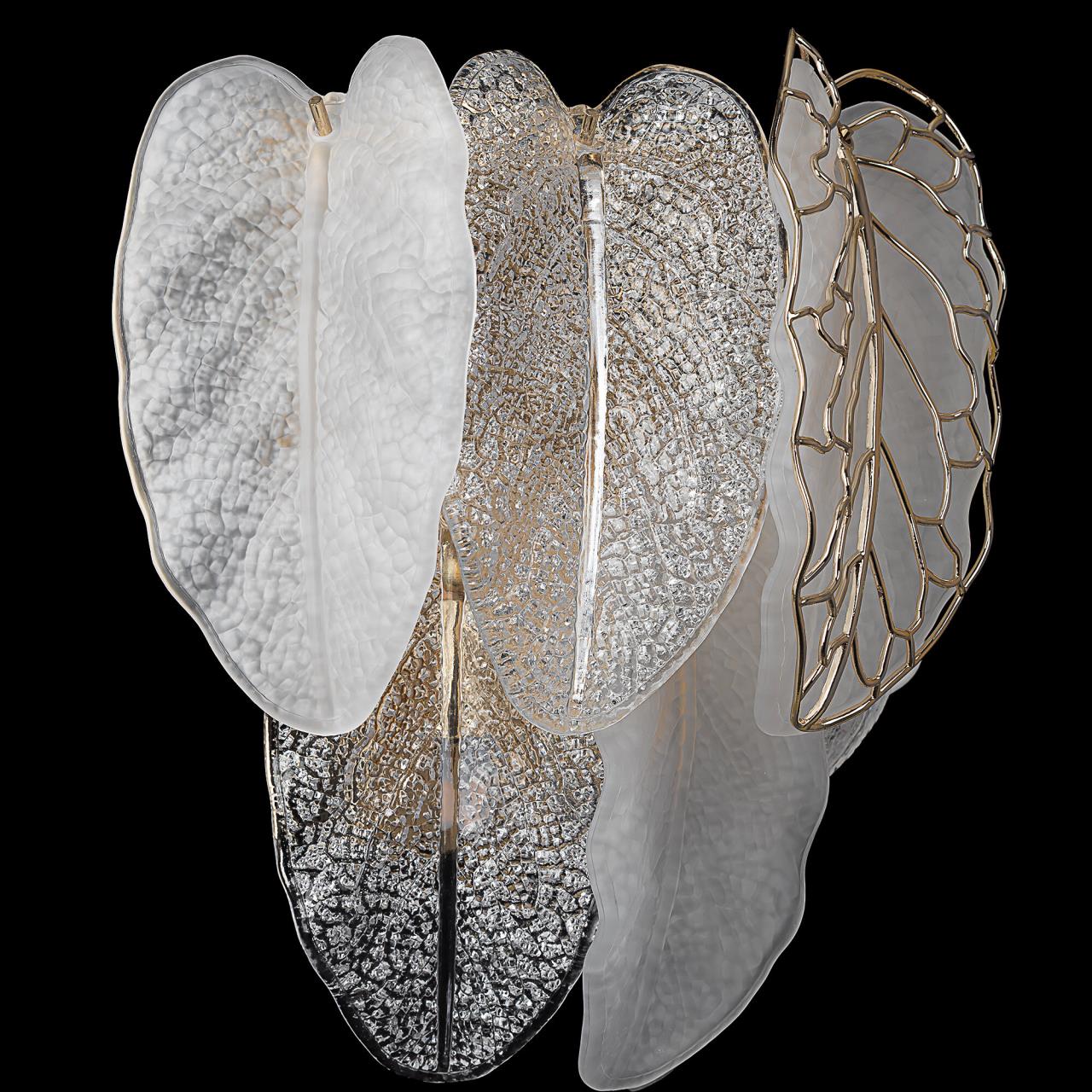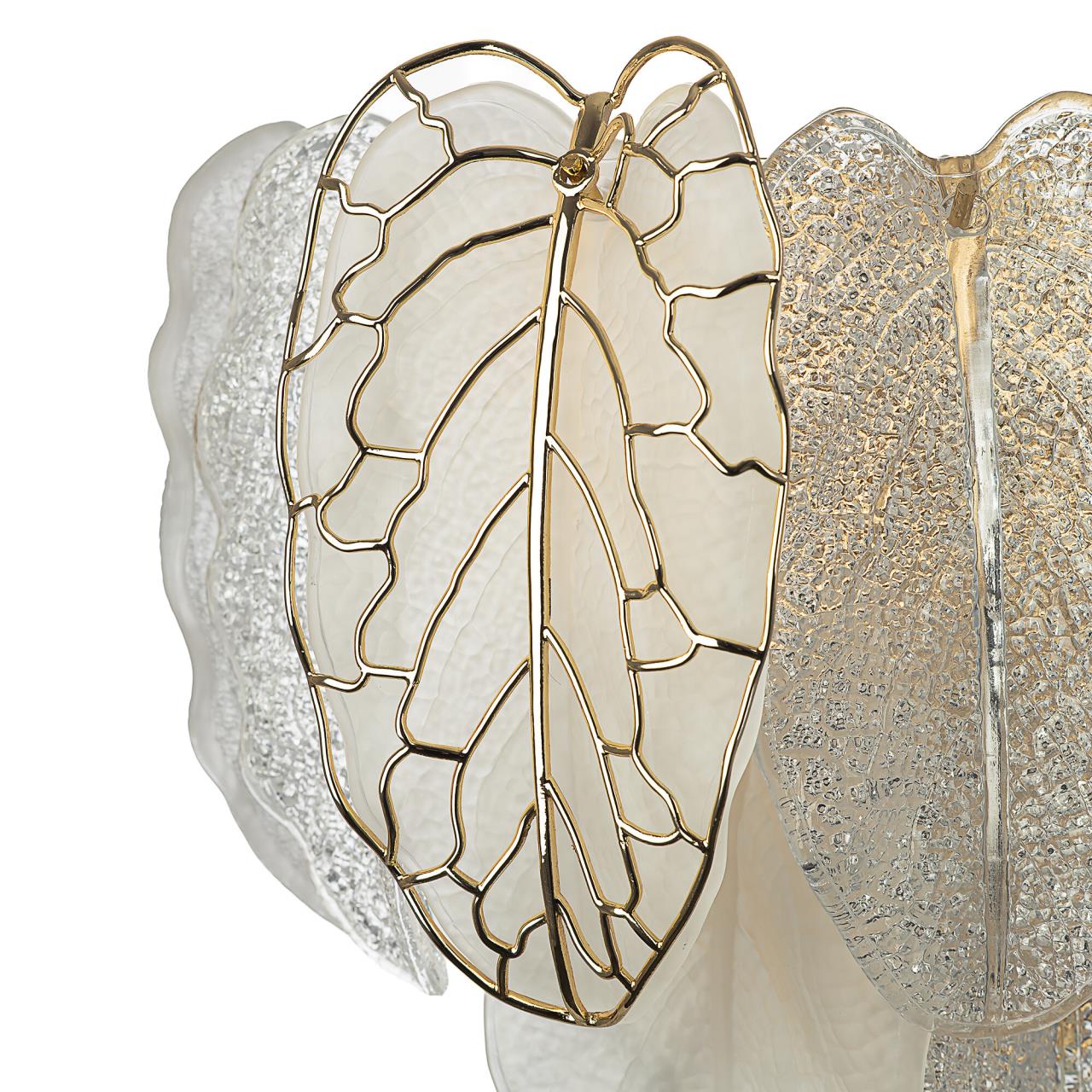 Металлический каркас золотистого оттенка переливается в лучах света, вступая в гармоничный союз с листьями из матового и прозрачного стекла и керамики. Металлические листья-подвески отлиты по ювелирной технологии, что подчёркивает изысканность и чёткость флористического рисунка. В изделии используется 5 лампочек с цоколем G9, тип крепления светильника — планка.