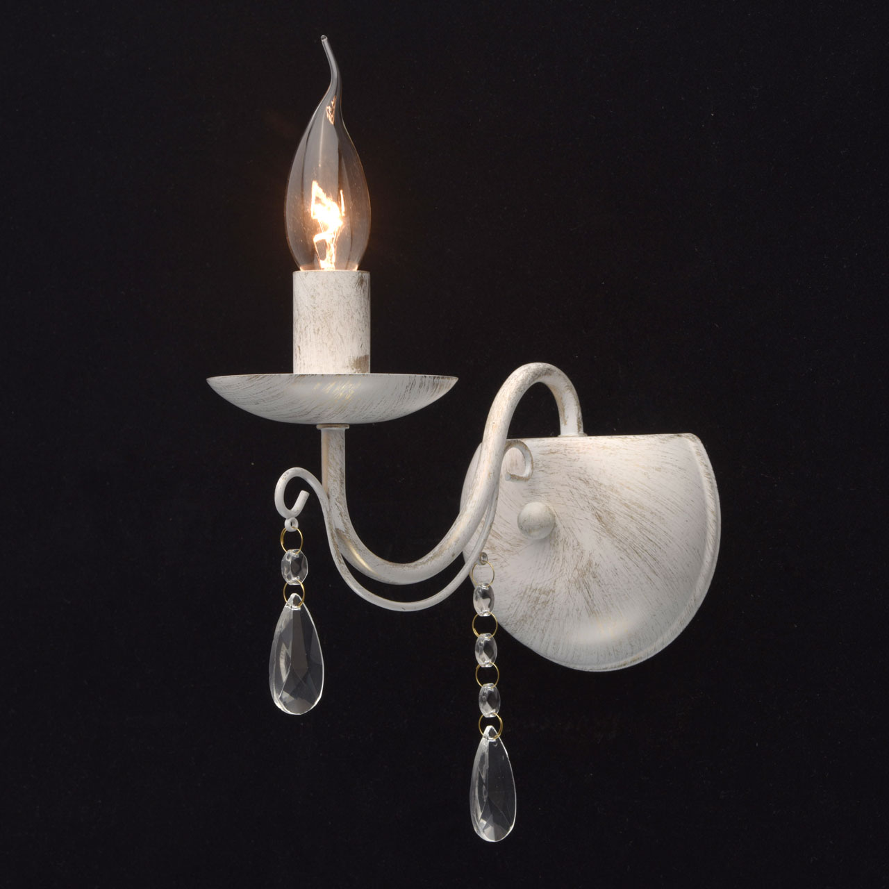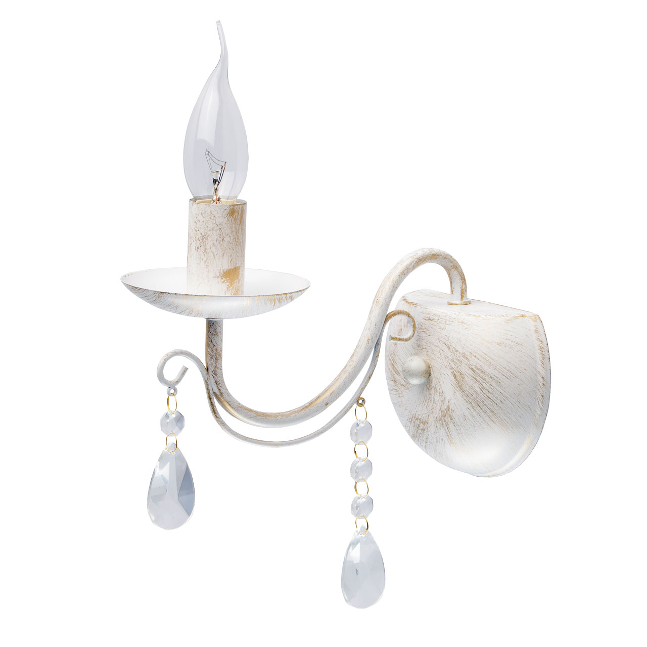Основание из металла, окрашена по технологии хай-лайт, основной слой белого матового цвета, декоративный слой цвета золота.Декоративные элементы изготовлены из металла по технологии проката на роликовом станке, розетки - технология токарной обработки.Декор: подвески из декоративного прозрачного стекла