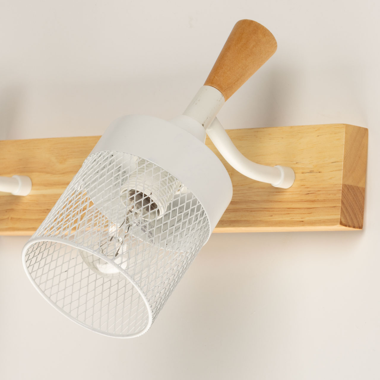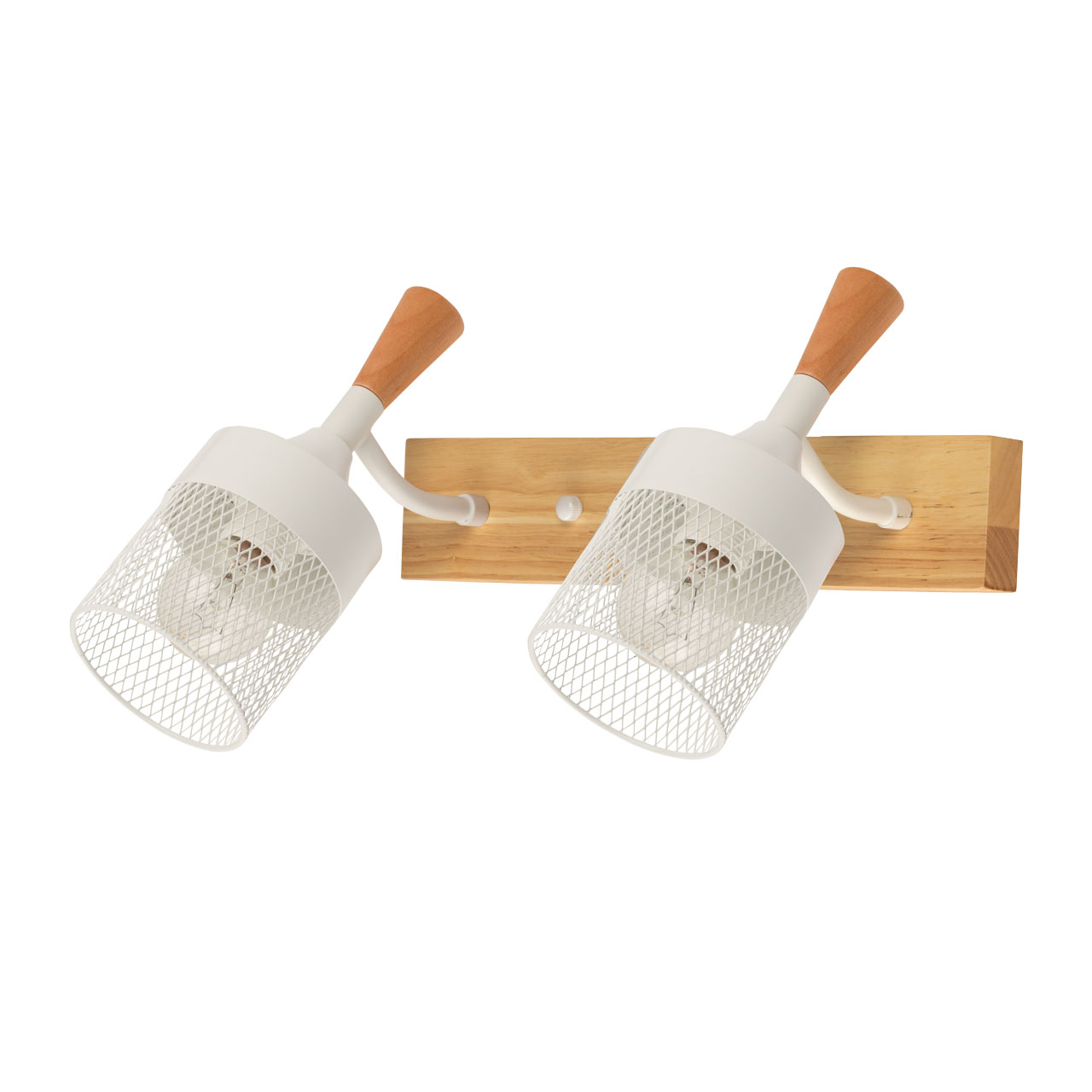 Металлические основание и плафоны настенного бра окрашены в белый цвет. Элемент крепления к стене и декор выполнены из натурального дерева.