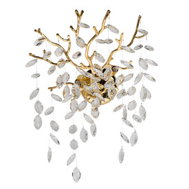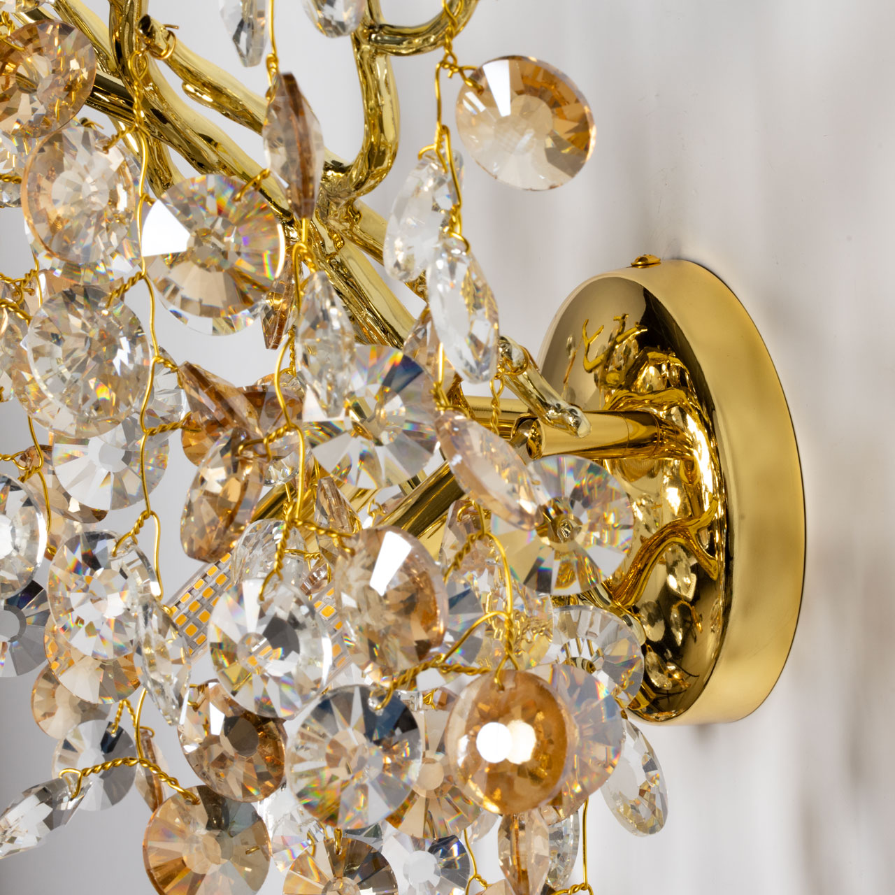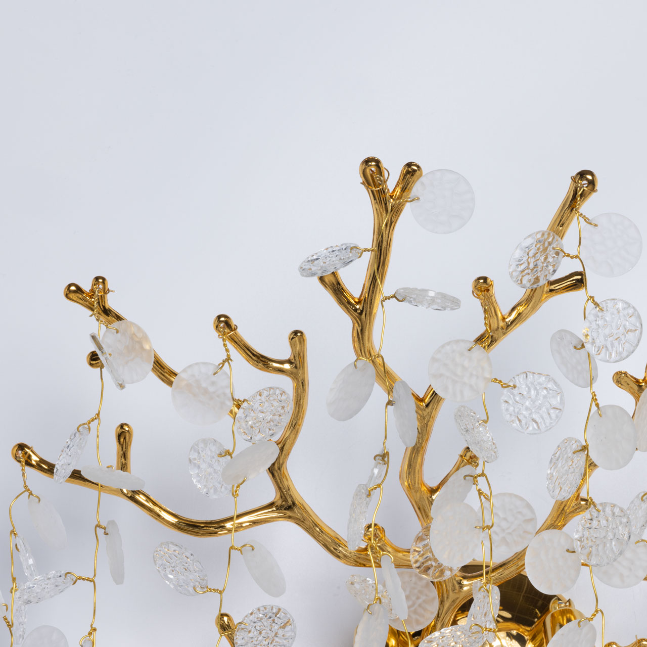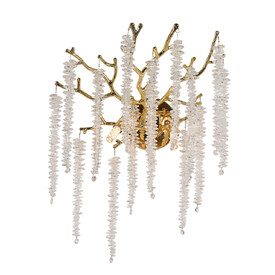 Основание настенного бра выполнено по технологии художественного литья из сплава алюминия с цинком и гальванизировано в цвет золота. Настенное бра декорировано прозрачным фактурным стеклом круглой формы.