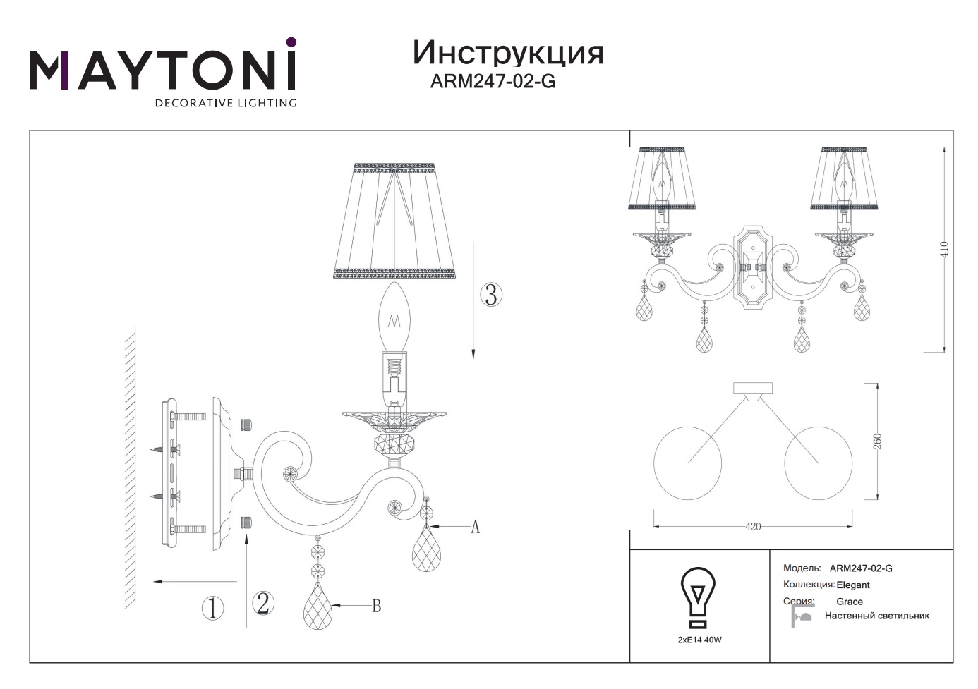 Maytoni Grace ARM247-02-G — это идеальный выбор для тех, кто ценит красоту и комфорт в своём доме. Светильники данной серии станут изюминкой любого интерьера и подчеркнут вашу индивидуальность.