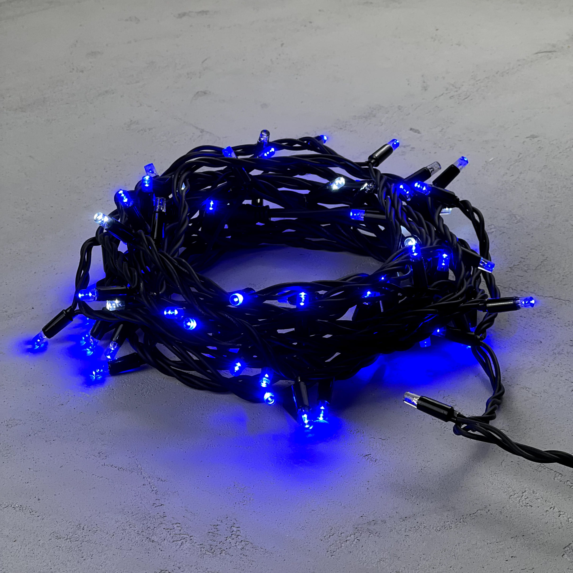Купить "Гирлянда Нить 10м Синяя с Мерцанием Белого Диода 220В, 75 LED, Провод Черный Каучук, IP65 LTC LL75BLW-1-2B"