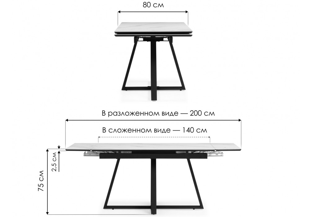 Материал каркаса - металл; Материал столешницы - Керамика; Ширина - 80; Высота - 75; Длина стола в разложенном виде - 200; Длина - 140;