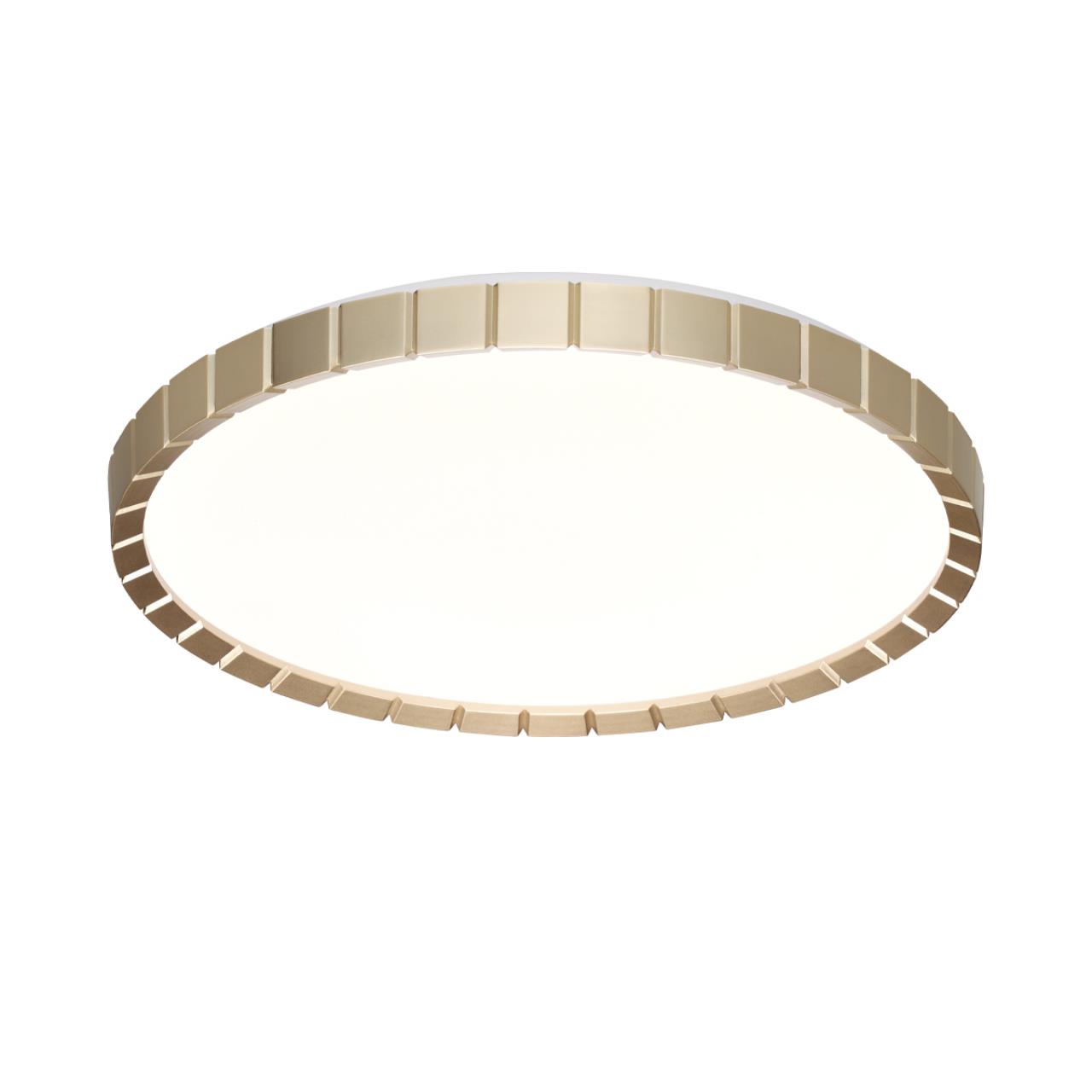 Светильник 7648/ELN линии ATABI GOLD состоит из металлического основания (базы) и пластикового рассеивателя. Материал рассеивателя — высококачественный пластик марки PMMA 2.0 белого цвета с матовой поверхностью без текстуры. Пластик обеспечивает светильнику равномерное рассеивание и хорошее светопропускание. Форма плафона: круглая, декорирована ободом из пластика золотого цвета с объемной структурой. Степень защиты IP43 позволяет использовать светильник в определенных зонах влажных помещений. В комплект входит LED-модуль с линзами мощностью 76 Вт, соответствующей лампе накаливания 740 Вт, а также переключатель температуры цвета (ССT) на драйвере, с помощью которого осуществляется изменение цветовой температуры 3000/4000/6000 К и переход светильника в режим теплого/белого/холодного света. Для установки необходимого режима рекомендуется использовать удлиненный тонкий предмет типа небольшой отвертки.