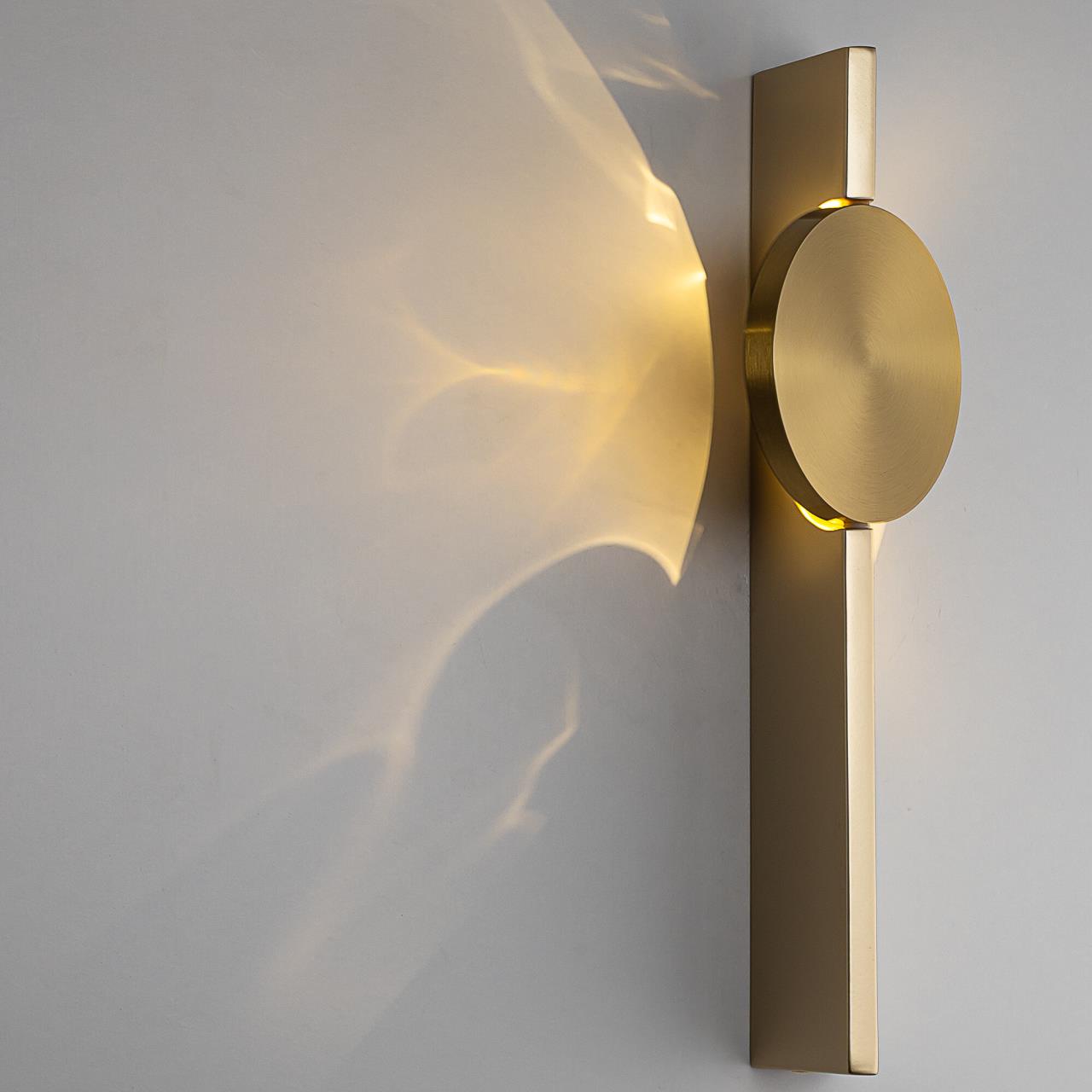 Тонкий металлический корпус матового золотого цвета имеет форму трапеции, благодаря чему светильники выглядят невесомыми и практически незаметными в интерьере. Встроенный светодиод мощностью 3Вт обеспечивает равномерное распределение света, без мерцания и пульсаций.