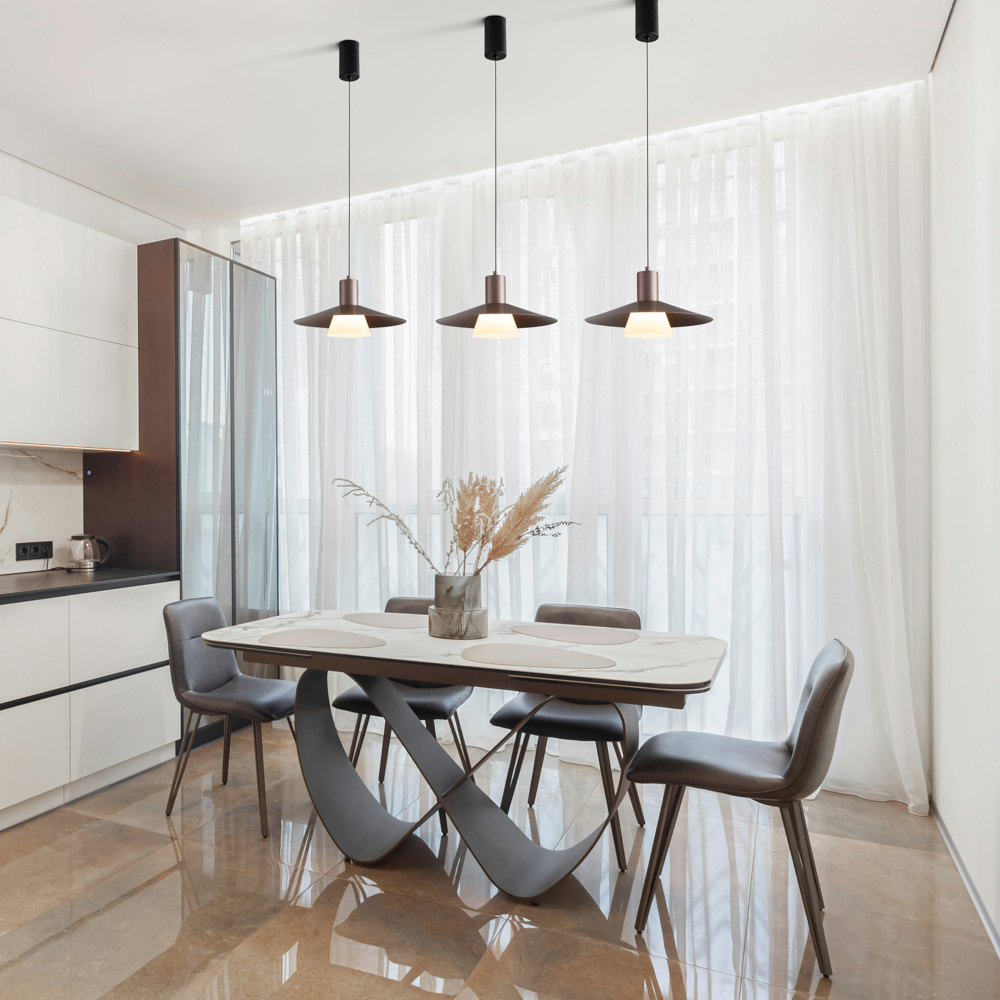 Арматура - металл. LED источник света (4000K). Подвесные светильники и бра настенные в золотом матовом оттенке плафонов и арматуры. Трансформируемые плафоны создают эффект аутдора.