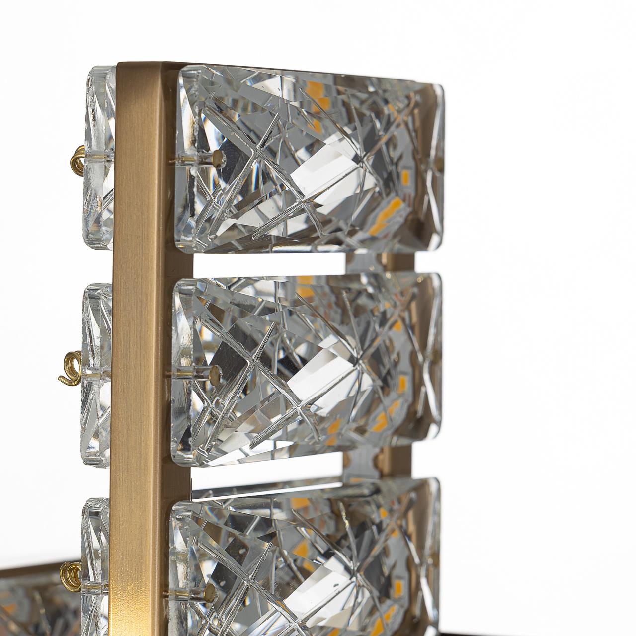 Каркас светильника — металлический, сочетаются черные и бронзовые элементы. На прямоугольном основании закреплены два вертикальных светодиодных модуля с хрустальным рассеивателем. Светодиодный свет с цветовой температурой 3000К мягко рассеивается в пространстве, играя на хрустальных гранях радужными искрами. Мощность бра — 12Вт, удобный выключатель-шнурок расположен на корпусе.