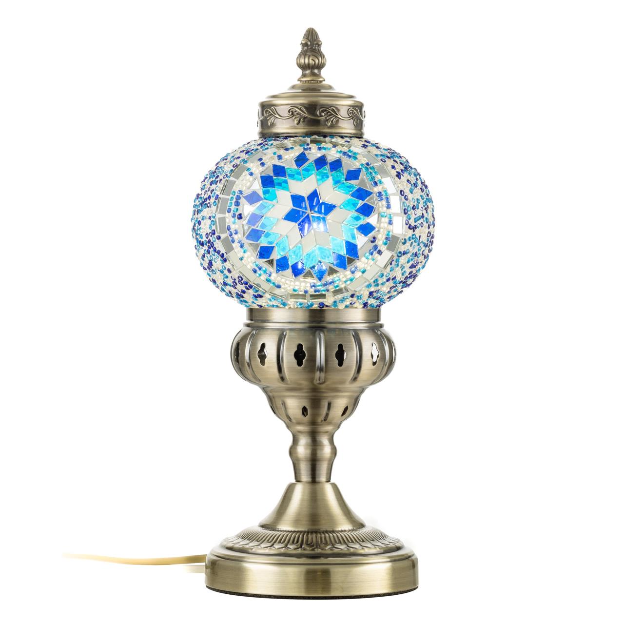Погрузитесь в атмосферу таинственного Востока с настольным светильником Citilux Каир CL419816! Металлический корпус цвета благородной бронзы украшен изысканной чеканкой, а плафон в форме шара, декорированный стеклянной мозаикой с сине-голубыми оттенками, создаёт мягкое свечение, наполняющее пространство чувством свежести и гармонии.