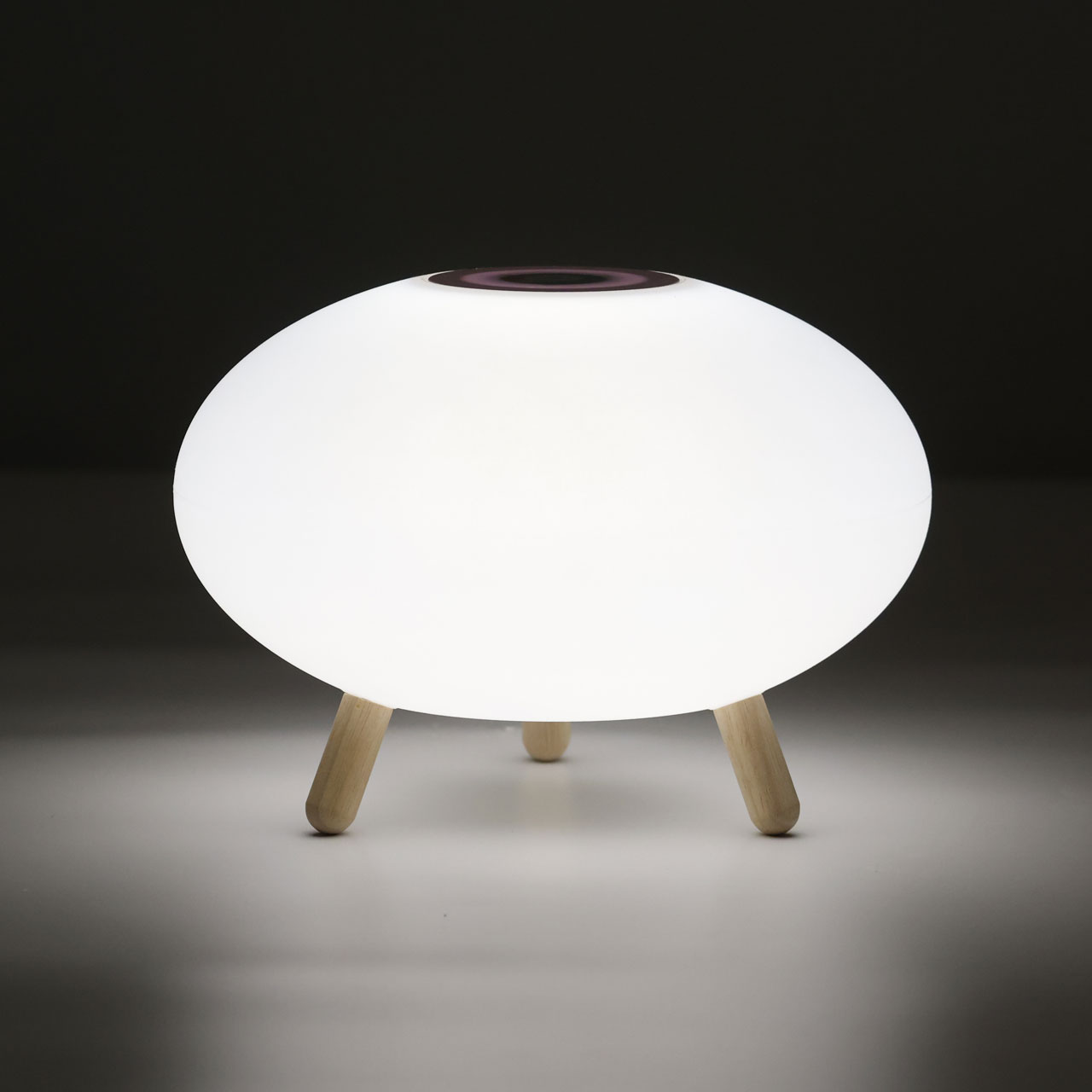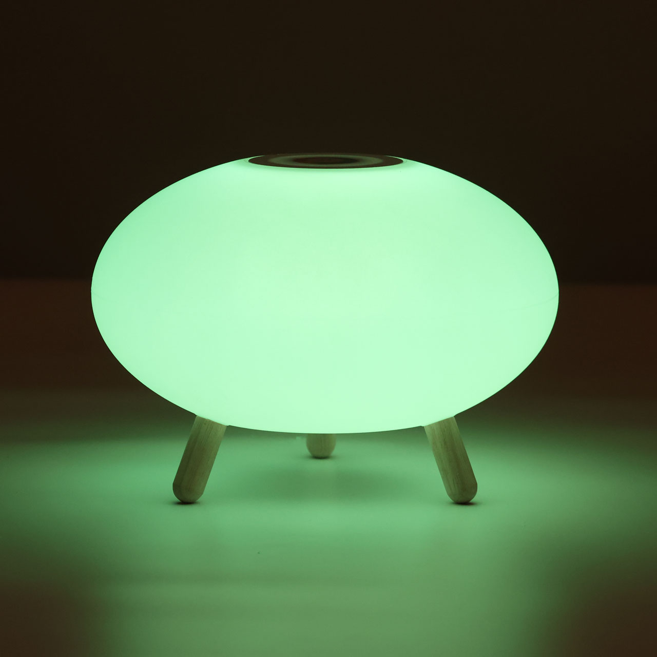 Светодиодный источник света белый, теплый+RGB закрыт белым матовым акрилом.Настольная лампа устанавливается на деревянные ножки цвета светлого дерева.Управление светильником расположены на корпусе плафона. Зарядный кабель USB входит в комплект.