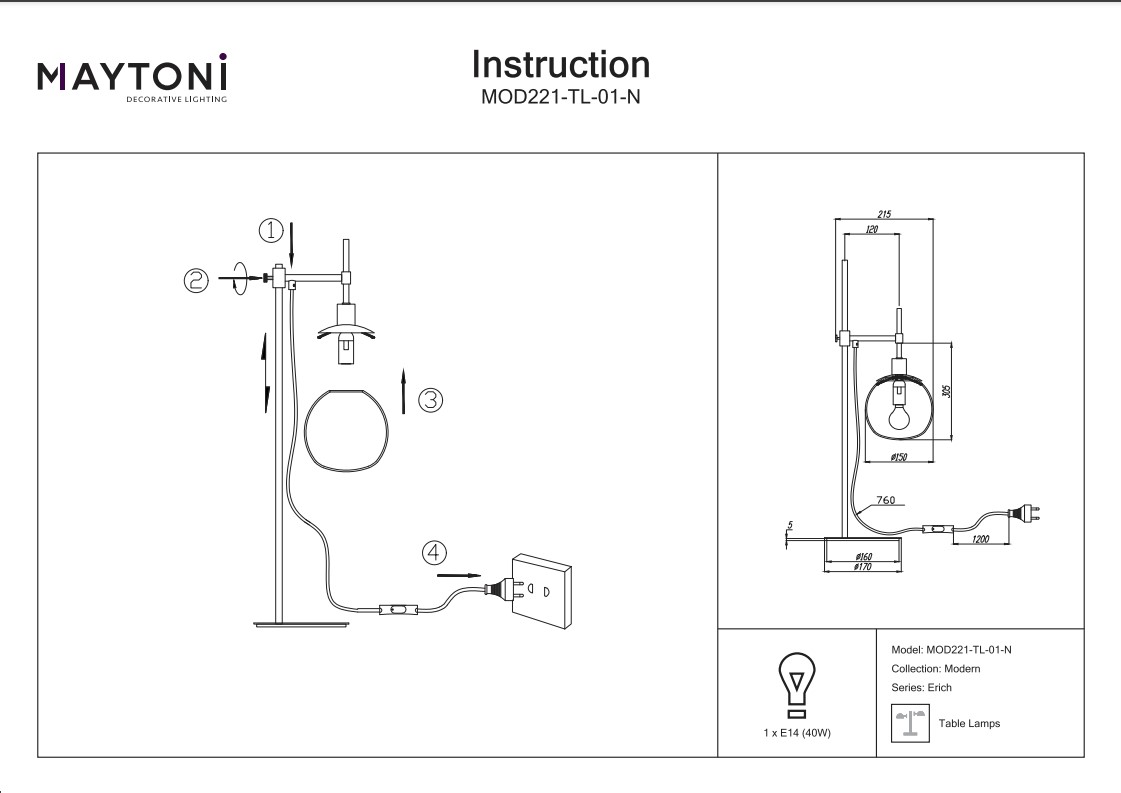Настольная лампа Maytoni Erich MOD221-TL-01-N, входящая в коллекцию Erich, отлично подойдет для освещения пространства в гостиной, в спальне, на даче, в кабинете, оформленных в современном стиле или в стиле Хай-тек. Данный артикул имеет один плафон диаметром 15 см белого цвета в форме шара, выполненного из стекла и направленного вниз, а также матовую никелированную арматуру, при этом высота светильника равна 65 см. Немецкий производитель Maytoni дает гарантию на свое изделие 2 года и рекомендует использовать для устройства энергосберегающие лампы или лампы накаливания с цоколем Е14 и мощностью 40 Вт, что позволяет осветить помещение площадью 2 кв. м. Технической особенностью этого настольного светильника является наличие выключателя на шнуре. Стильный дизайн и матовая поверхность плафона и арматуры настольной лампы Maytoni Erich MOD221-TL-01-N делают ее особенным элементом декора, который украсит любое интерьерное пространство.