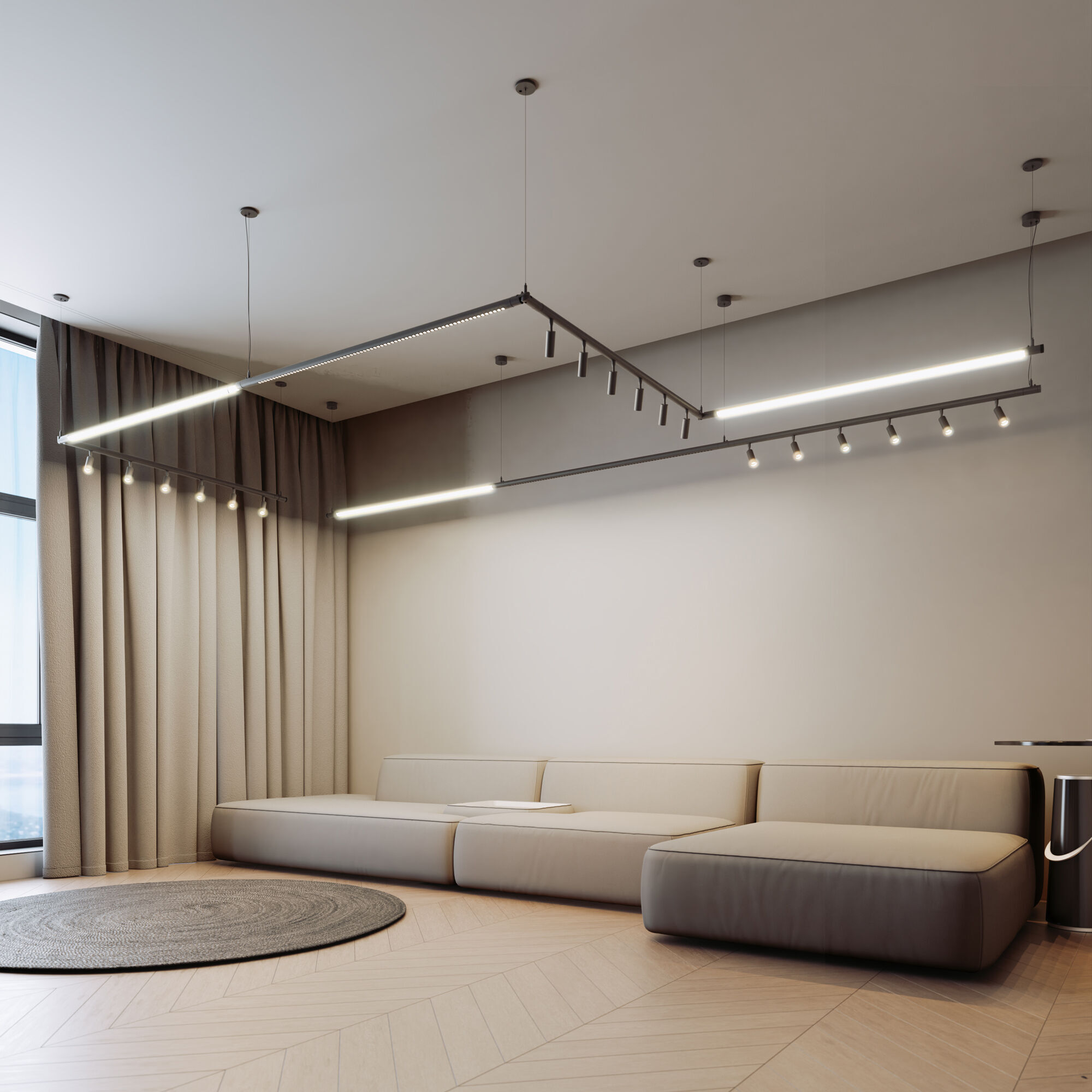 Module System подходит для готового ремонта благодаря накладному монтажу. Монтируется на декоративных гибких стойках и подвесах с возможностью регулирования высоты, к которым крепятся световые модули.