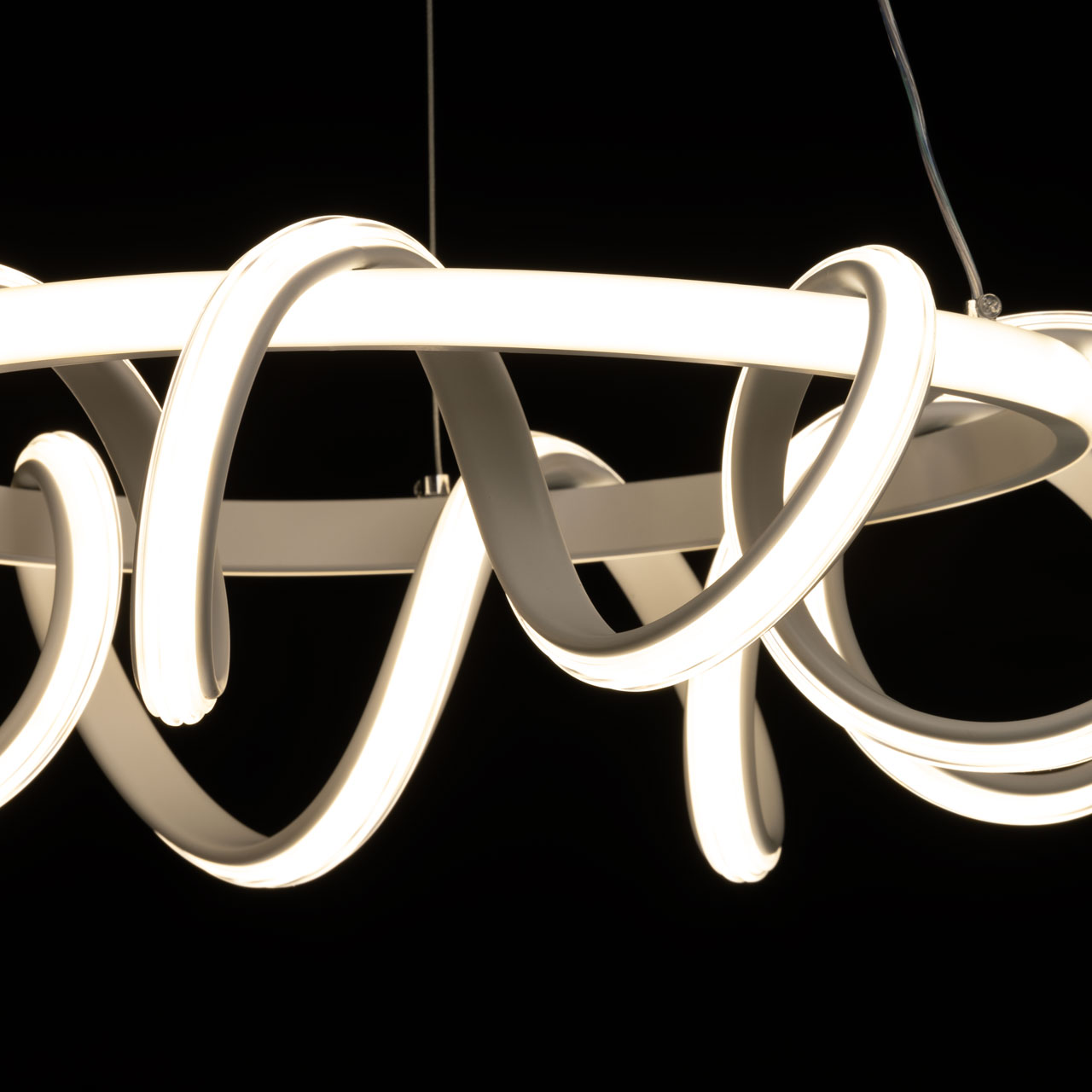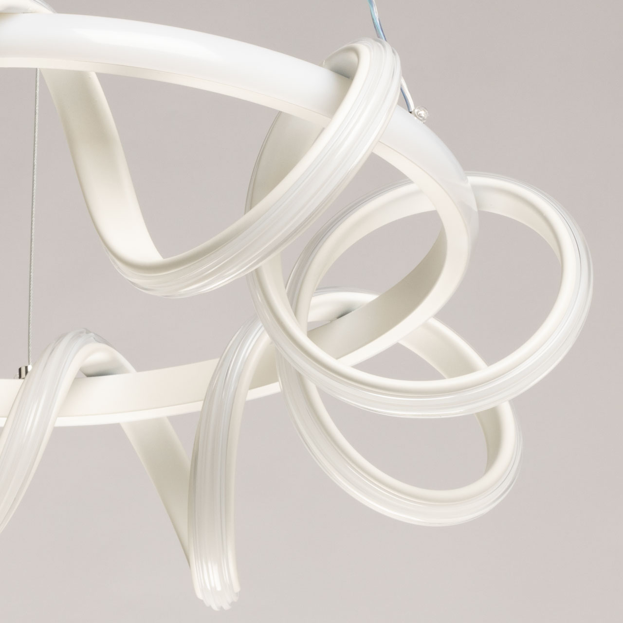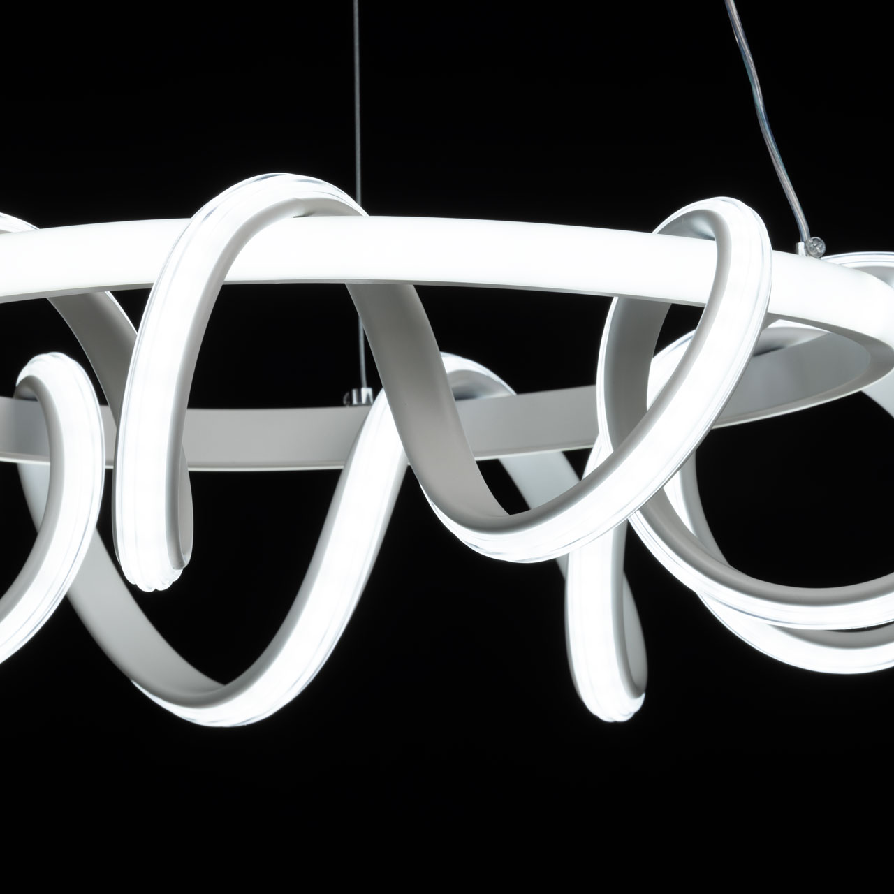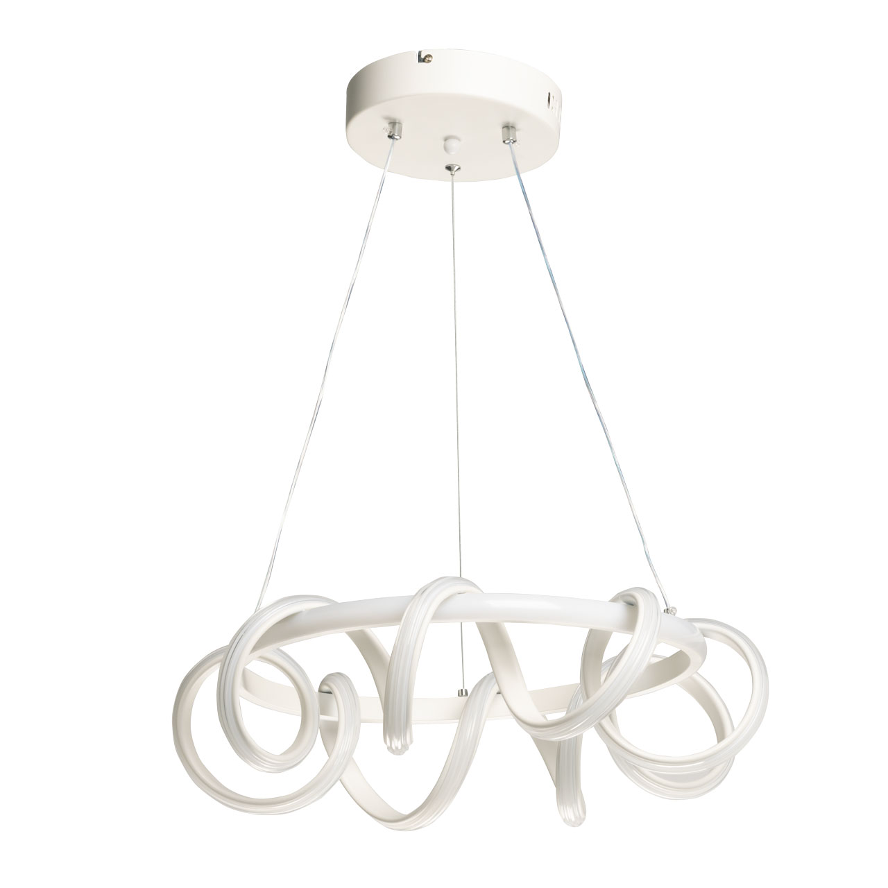 Металлическое основание подвесной люстры окрашено в белый цвет. Корпус плафона выполнен из сплава алюминия и окрашен в белый цвет. Светодиодные источники света закрыты белым силиконом.