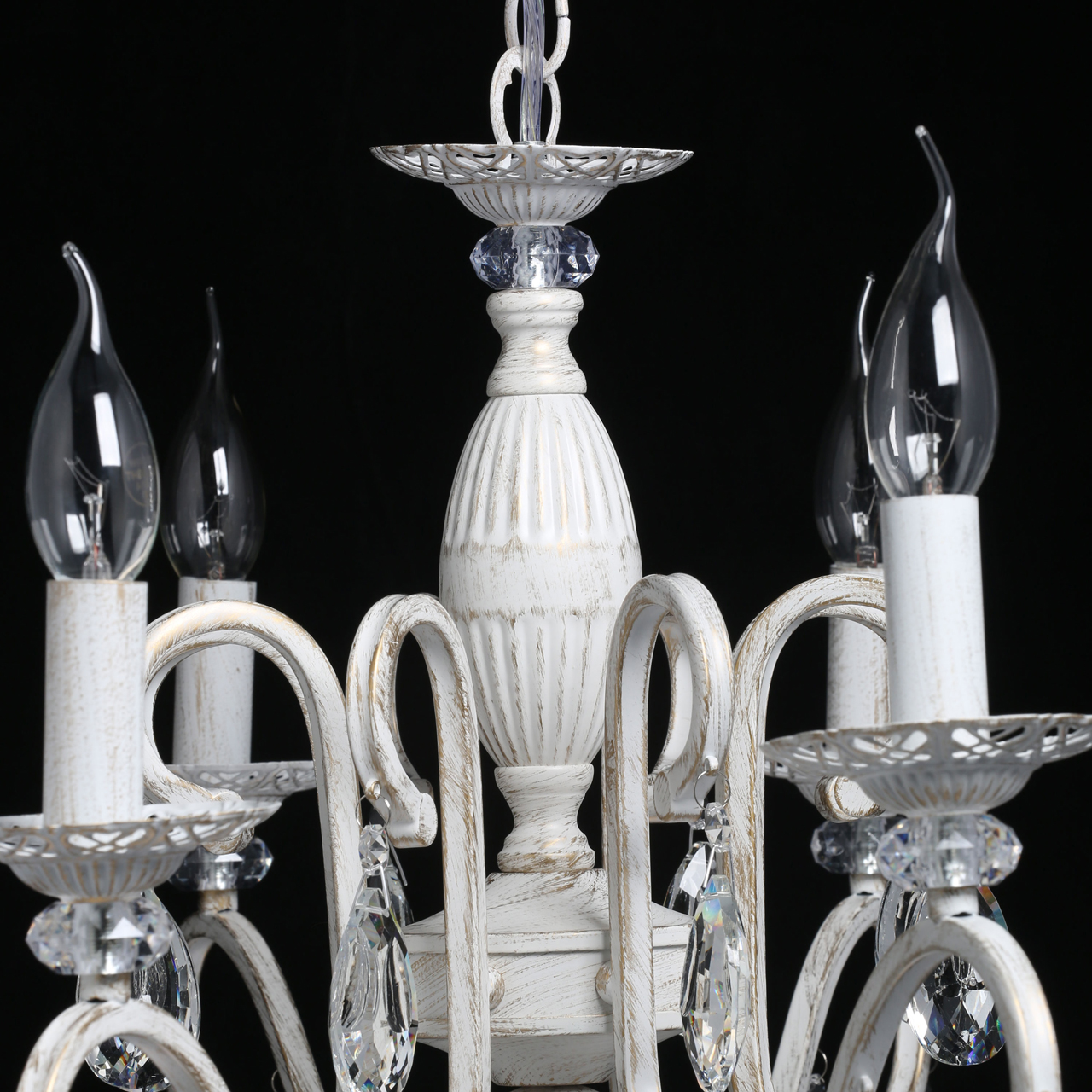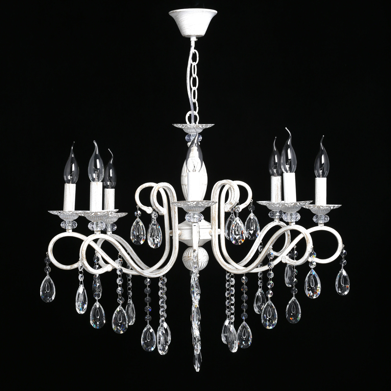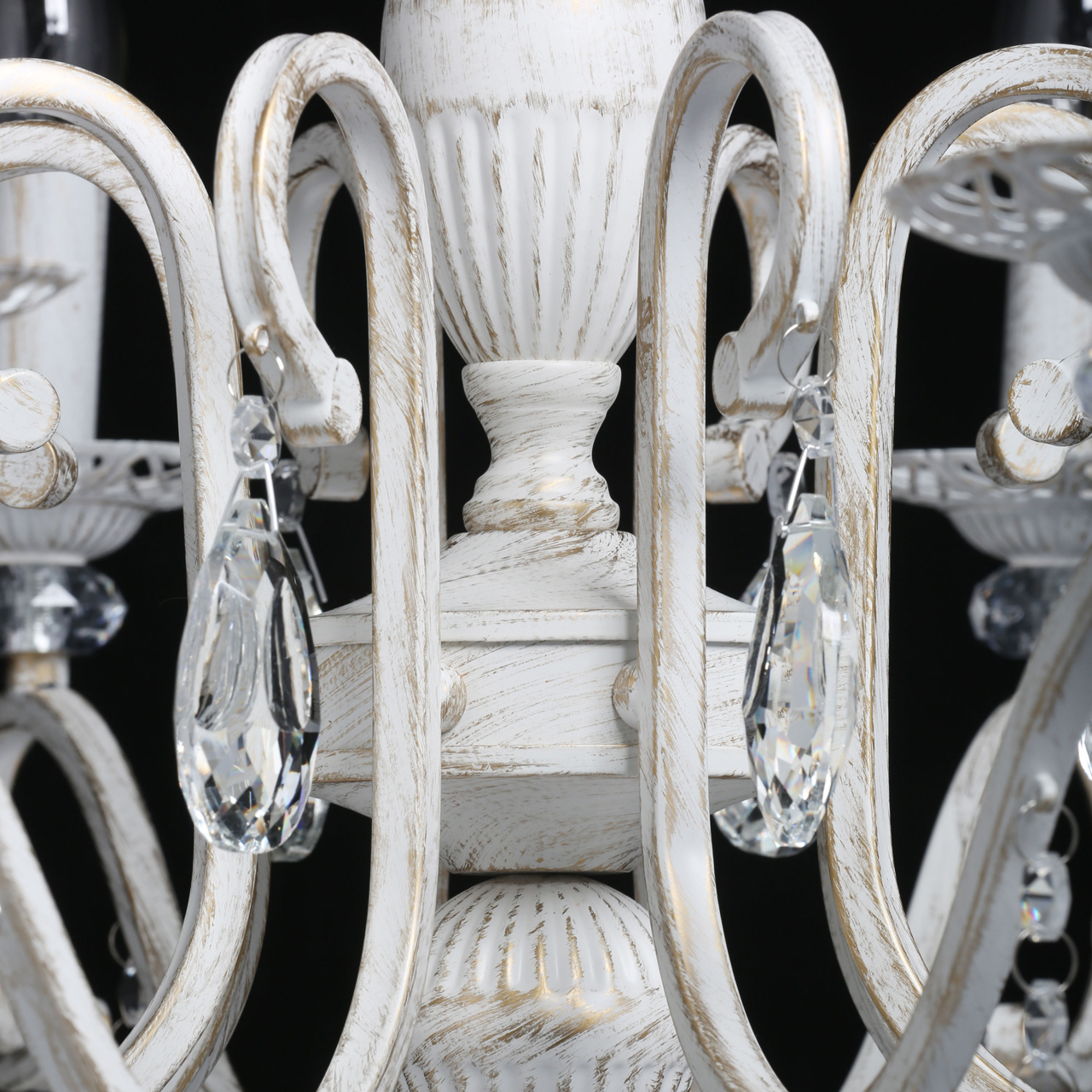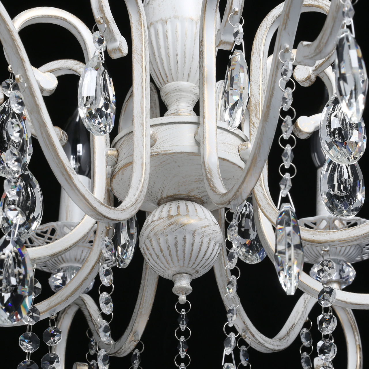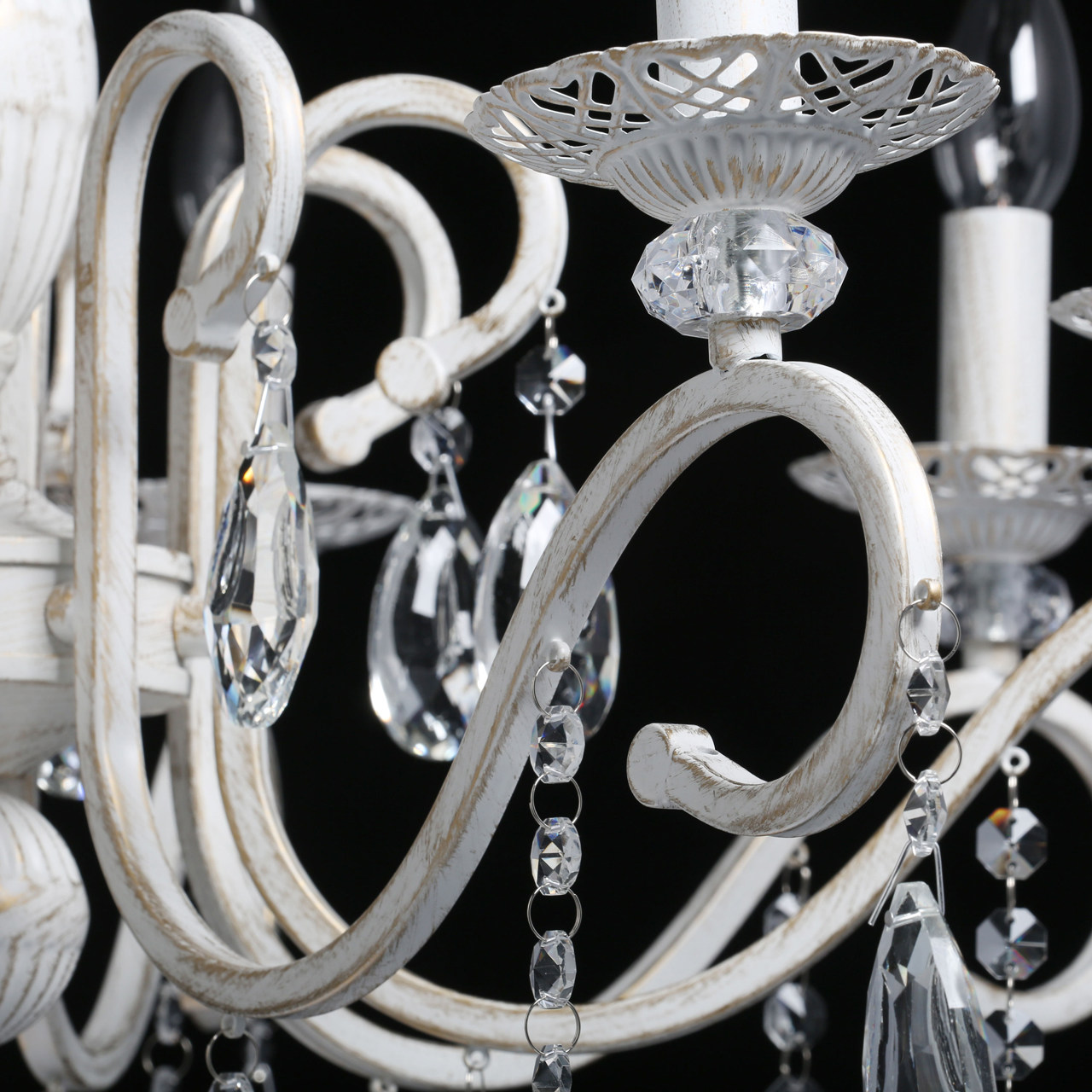 Классическая форма рожков-свечей с наборным основанием белого цвета с золотистой патинойШирокий диаметр у модели на 8 рожков .Оригинальная огранка хрустальных подвесок.Декор рожков с резными розетками придает легкости конструкции.Возможность регулировать высоту светильника, убирая лишние звенья цепи.