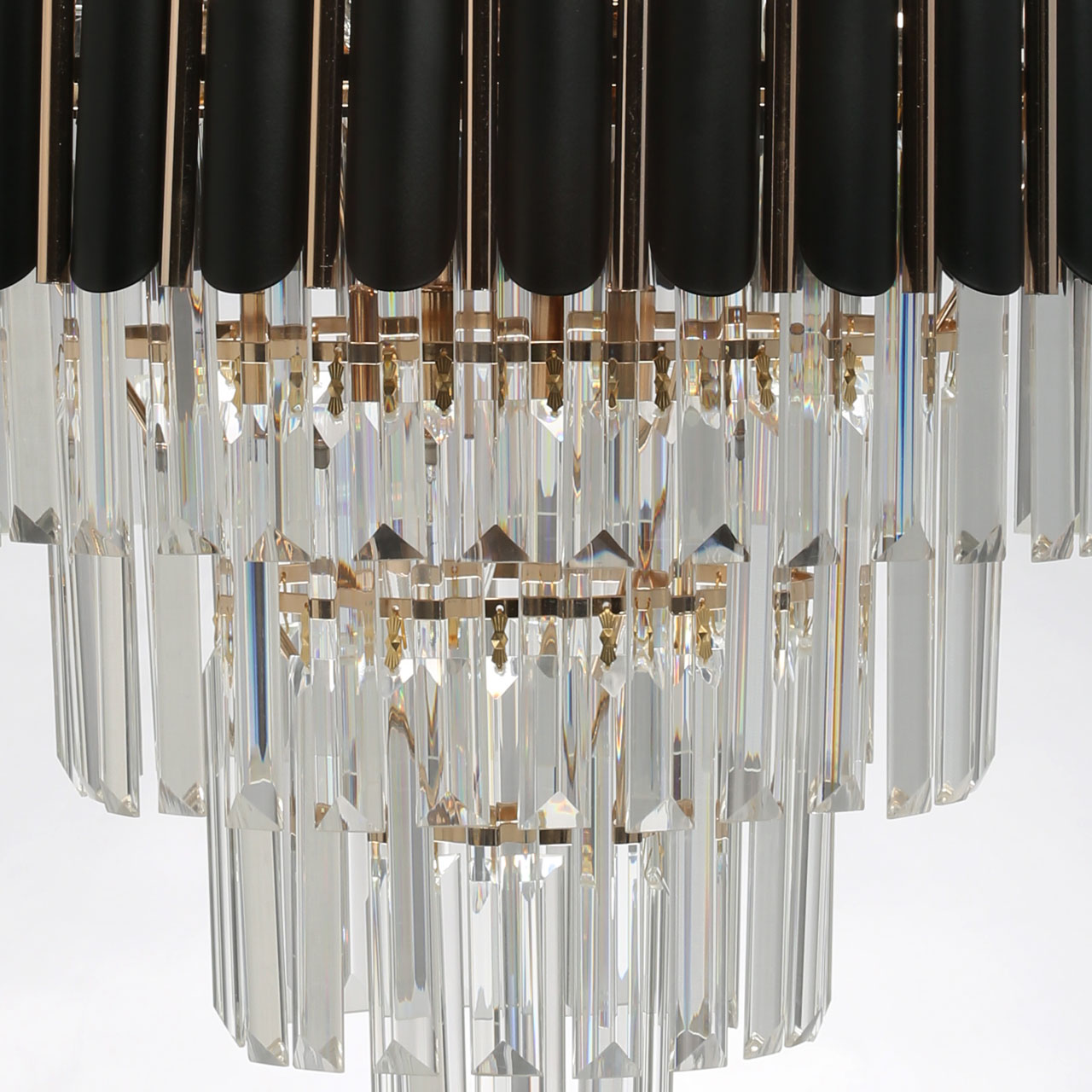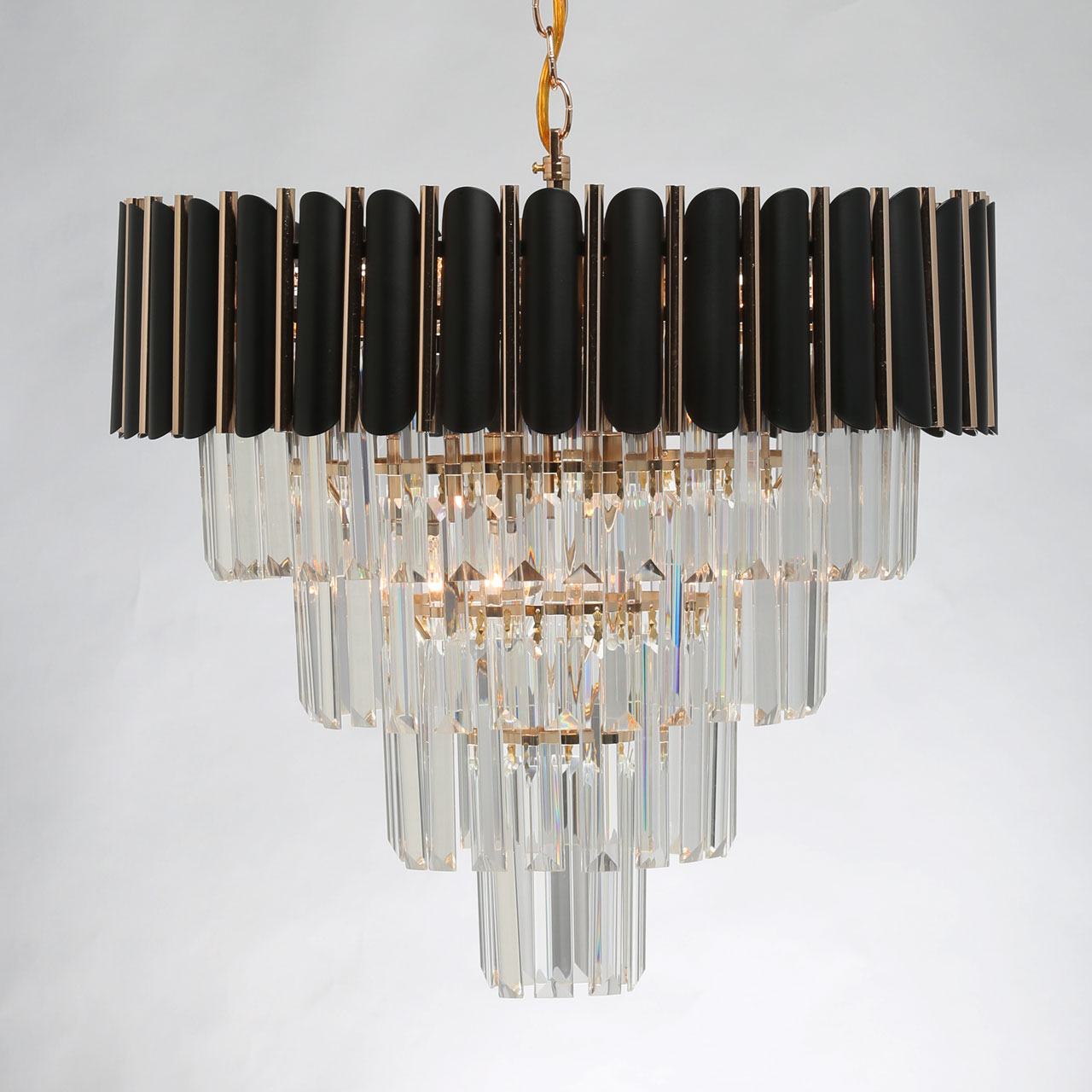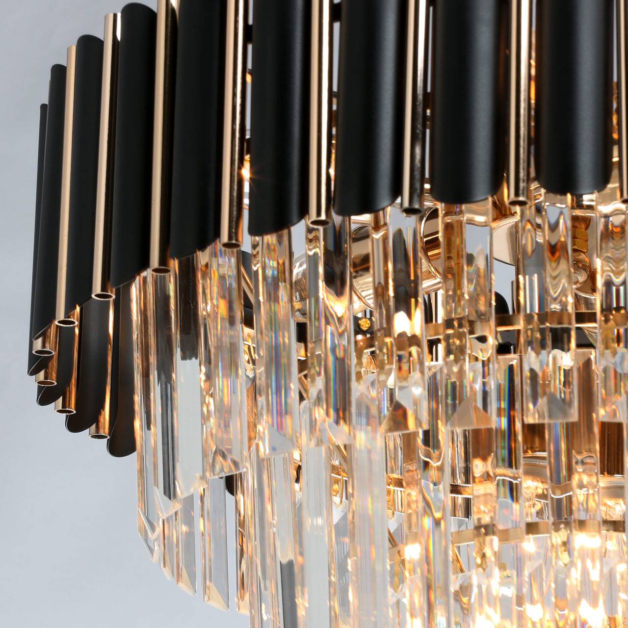 Дизайн-идея в каскаде ярусов различного размера и формы и материалов.Верхний ярус из металлических трубочек черного и золотого цвета.Четыре последующих яруса из прозрачного хрусталя трехгранной формы.Хрусталь отлично пропускает световой поток. создавая красивую игру света.Регулируемая высота светильника за счет звеньев цепи.