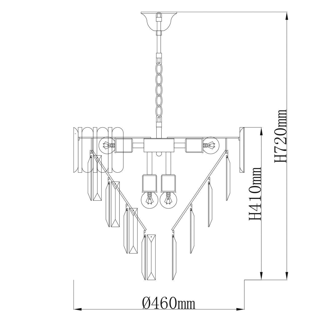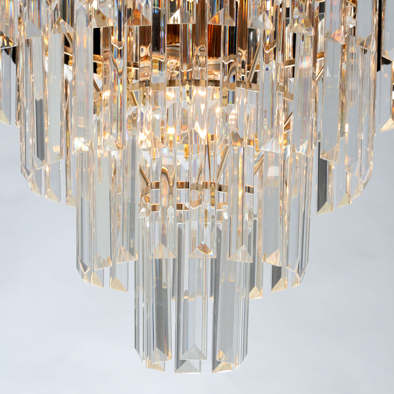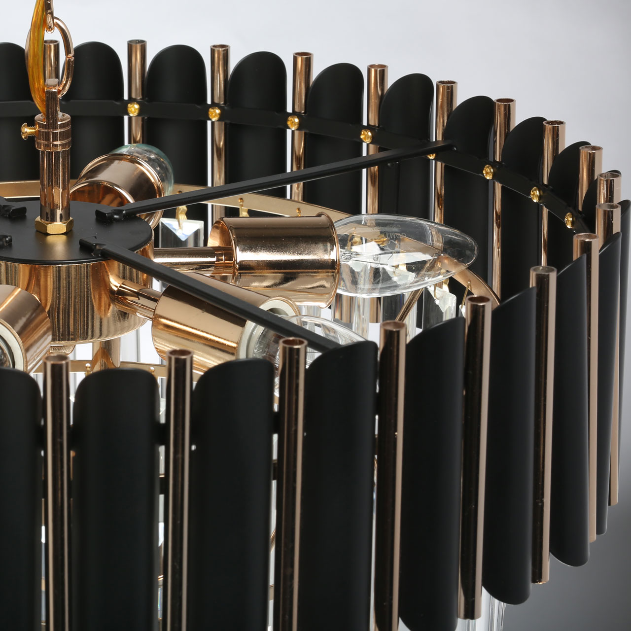 Дизайн-идея в каскаде ярусов различного размера и формы и материалов.Верхний ярус из металлических трубочек черного и золотого цвета.Четыре последующих яруса из прозрачного хрусталя трехгранной формы.Хрусталь отлично пропускает световой поток. создавая красивую игру света.Регулируемая высота светильника за счет звеньев цепи.
