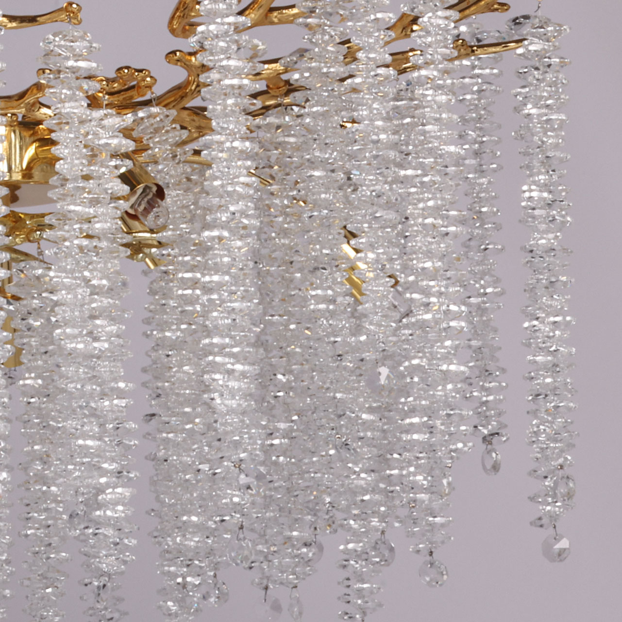 Основание подвесной люстры выполнено по технологии художественного литья из сплава алюминия с цинком и гальванизировано в цвет золота. Люстра декорирована гроздьями из прозрачного хрусталя. Потолочная чаша декорирована фактурной чеканкой.
