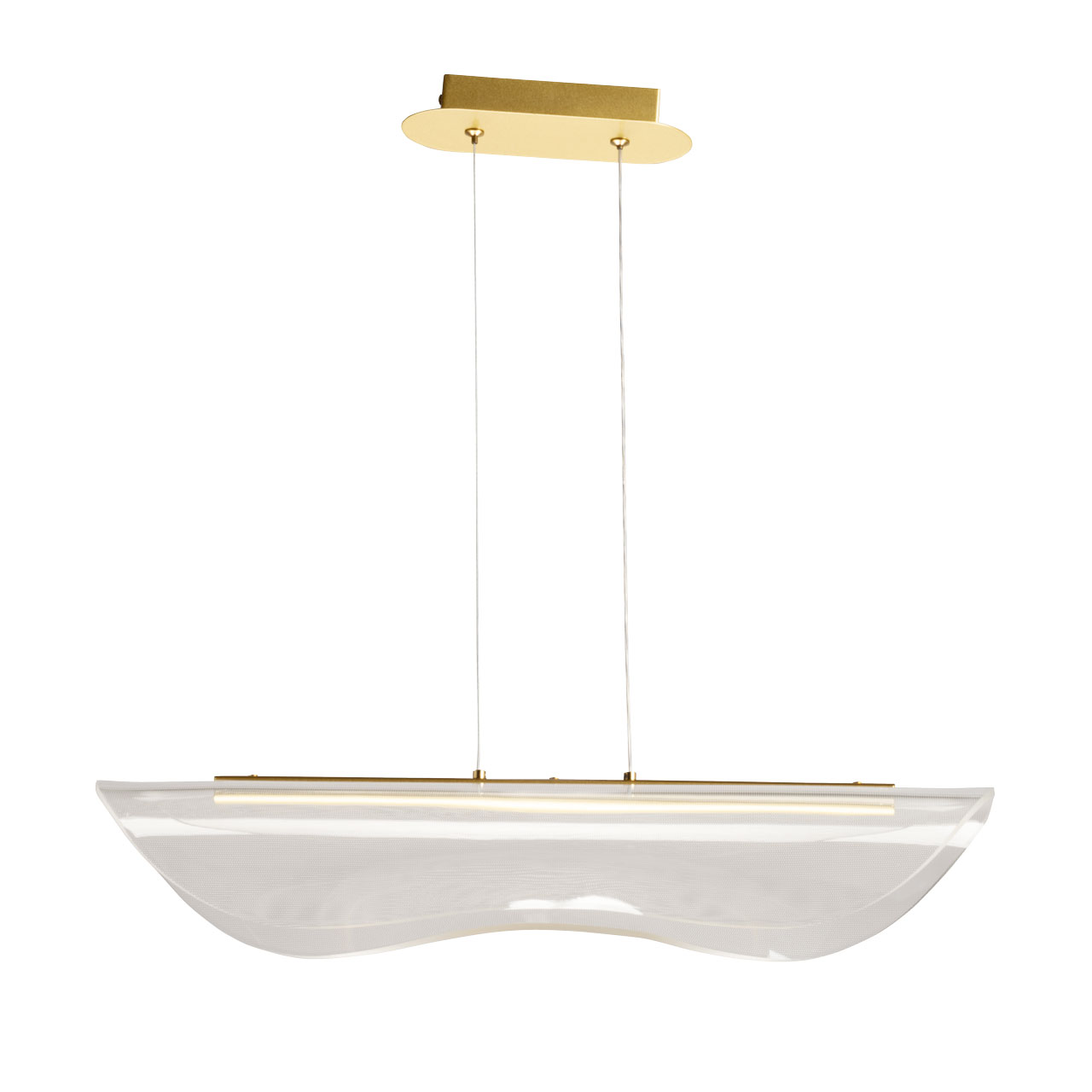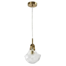 Металлическое основание подвесной люстры гальванизировано в цвет золота. Люстра декорирована прозрачным акрилом оригинальной формы.