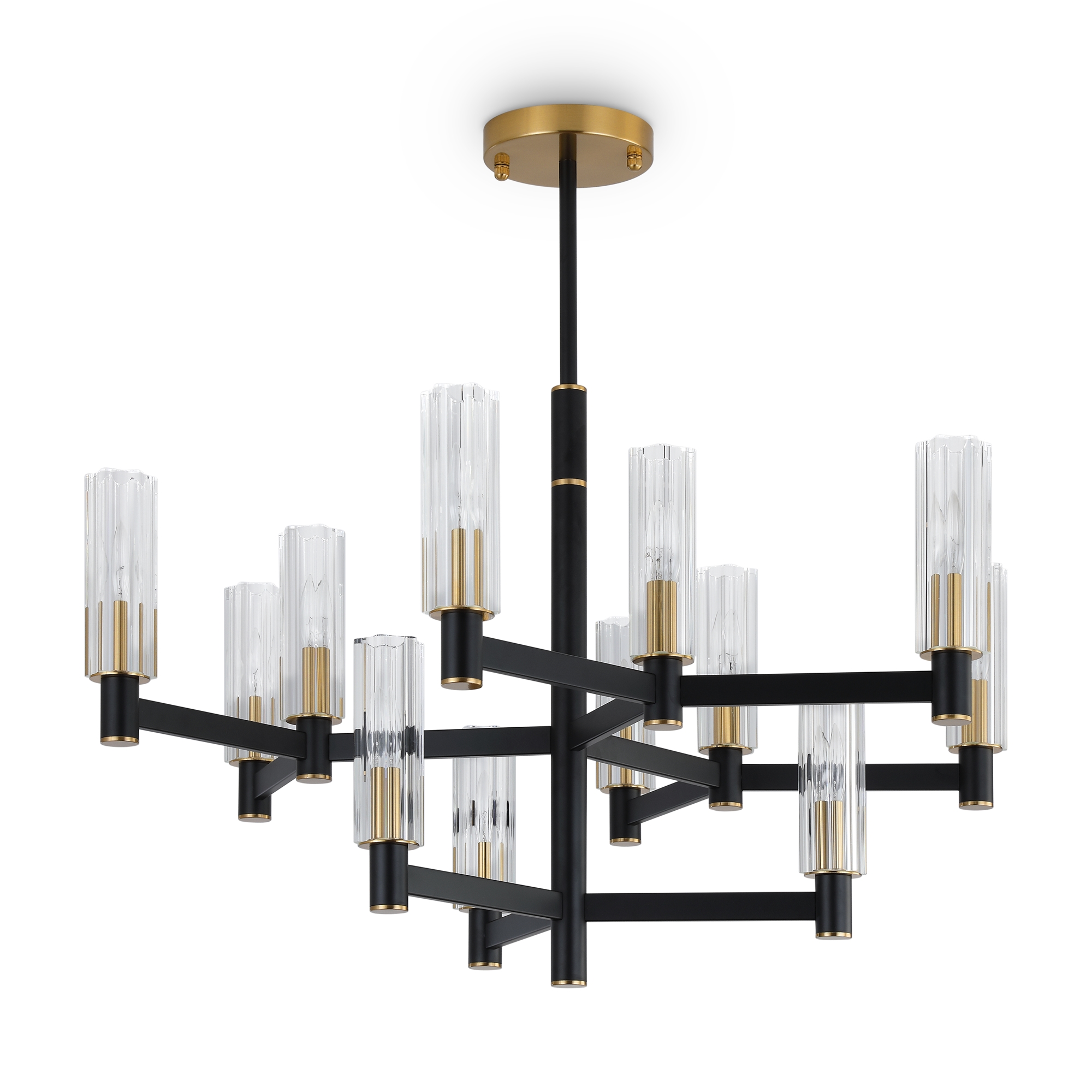 Арматура из металла сочетает два оттенка: черный и латунь. Плафоны цилиндрической формы выполнены из рельефного прозрачного стекла. Актуальная геометрия с настроением американской классики. Источник света – лампа с цоколем E14.