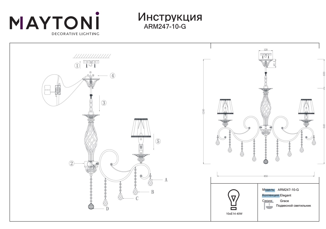 Подвесная люстра Maytoni Grace ARM247-10-G, имеющая 1 класс защиты, станет не только источником света, но и стильным акцентом в вашем интерьере.