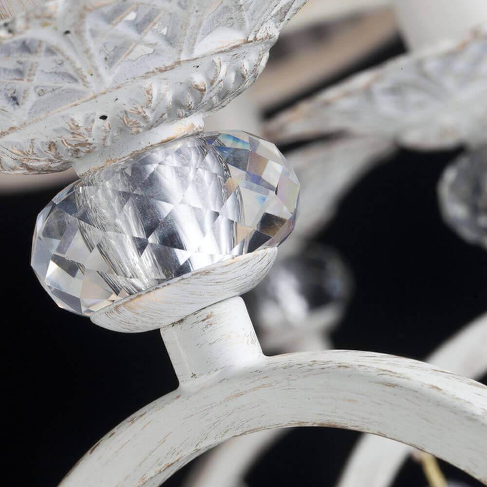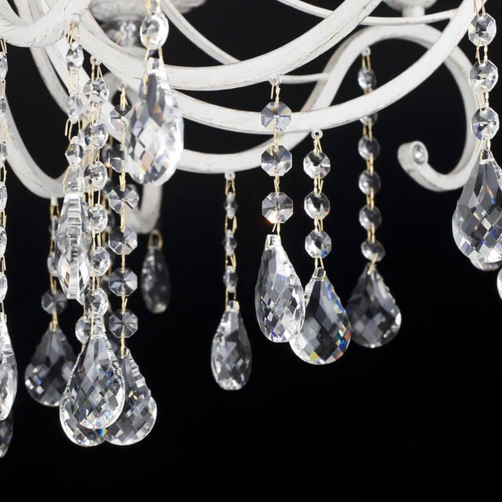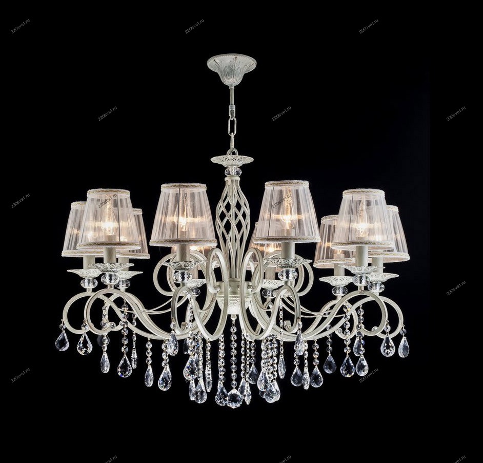 Белые текстильные абажуры из органзы и металлическая арматура белого цвета с золотом гармонично дополняют друг друга, делая эту модель люстры ещё более привлекательной. Она оснащена 10 лампами с типом цоколя Е14 и мощностью 40 Вт каждая, общая мощность составляет 400 Вт, что позволяет создать комфортное освещение на площади в 30 квадратных метров. В качестве декоративных элементов используются витиеватые сплетения металла в основании светильника и подвесы из кристаллов, подчеркивающие роскошь и стиль. Тип подвеса - цепь, длина которой составляет 530 мм. Технической особенностью является регулировка по высоте.