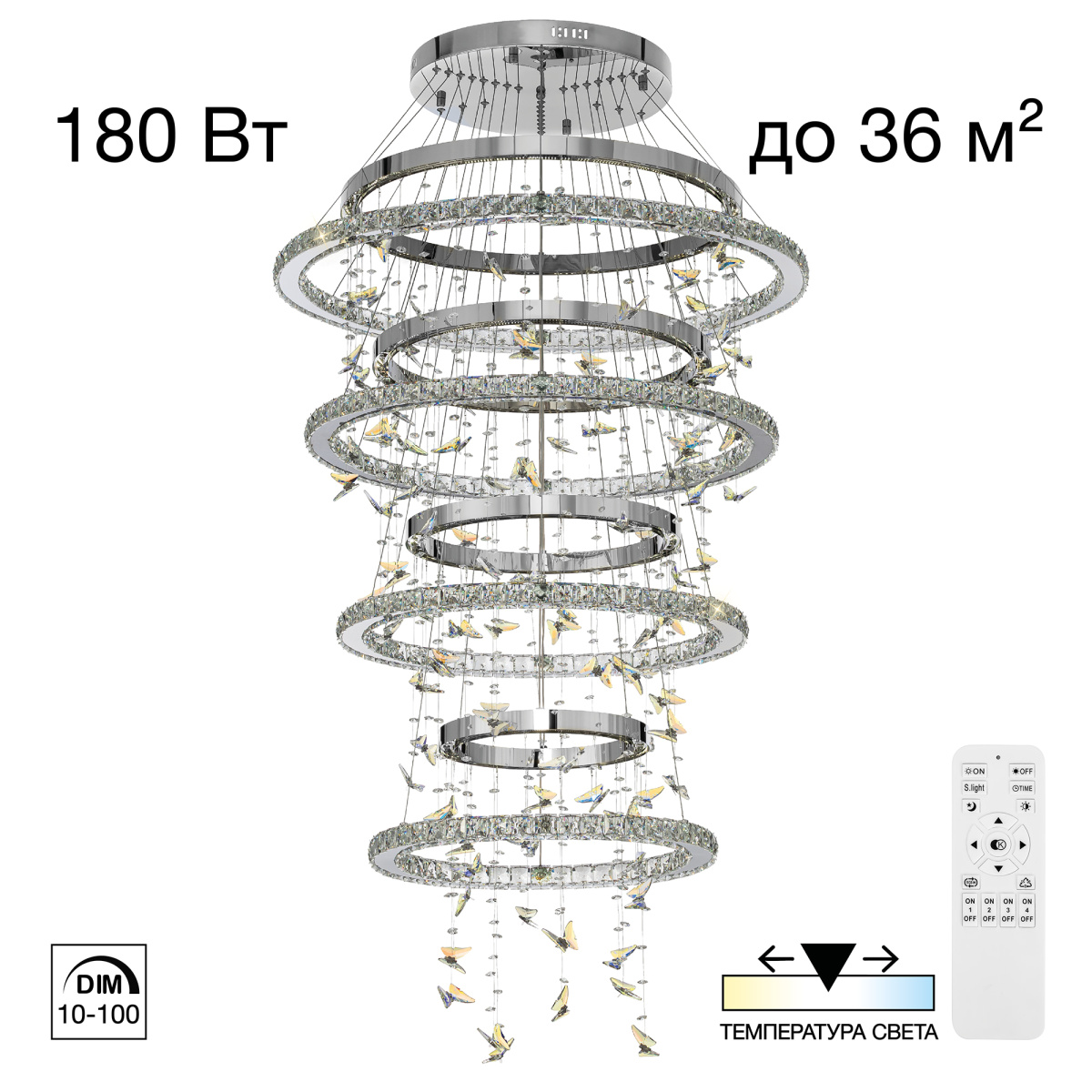С помощью пульта вы легко настроите нужную атмосферу в помещении: плавно измените яркость от мягкого свечения (10%) до яркого дневного света (100%), выберите оттенок — от тёплого золотистого (3000K) до холодного кристально-белого (5500K). А если вечером вам нужно лишь лёгкое сияние, включите режим ночника или установите таймер отключения, чтобы свет мягко погас. Четыре независимых канала управления, позволяют синхронизировать люстру с другими светильниками коллекции, создавая гармоничную световую композицию.
