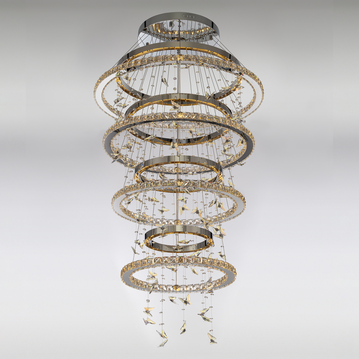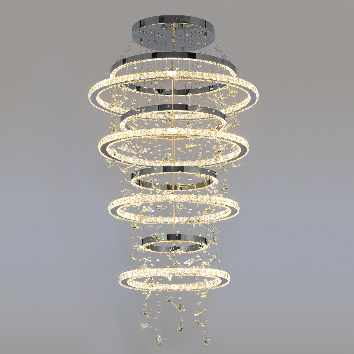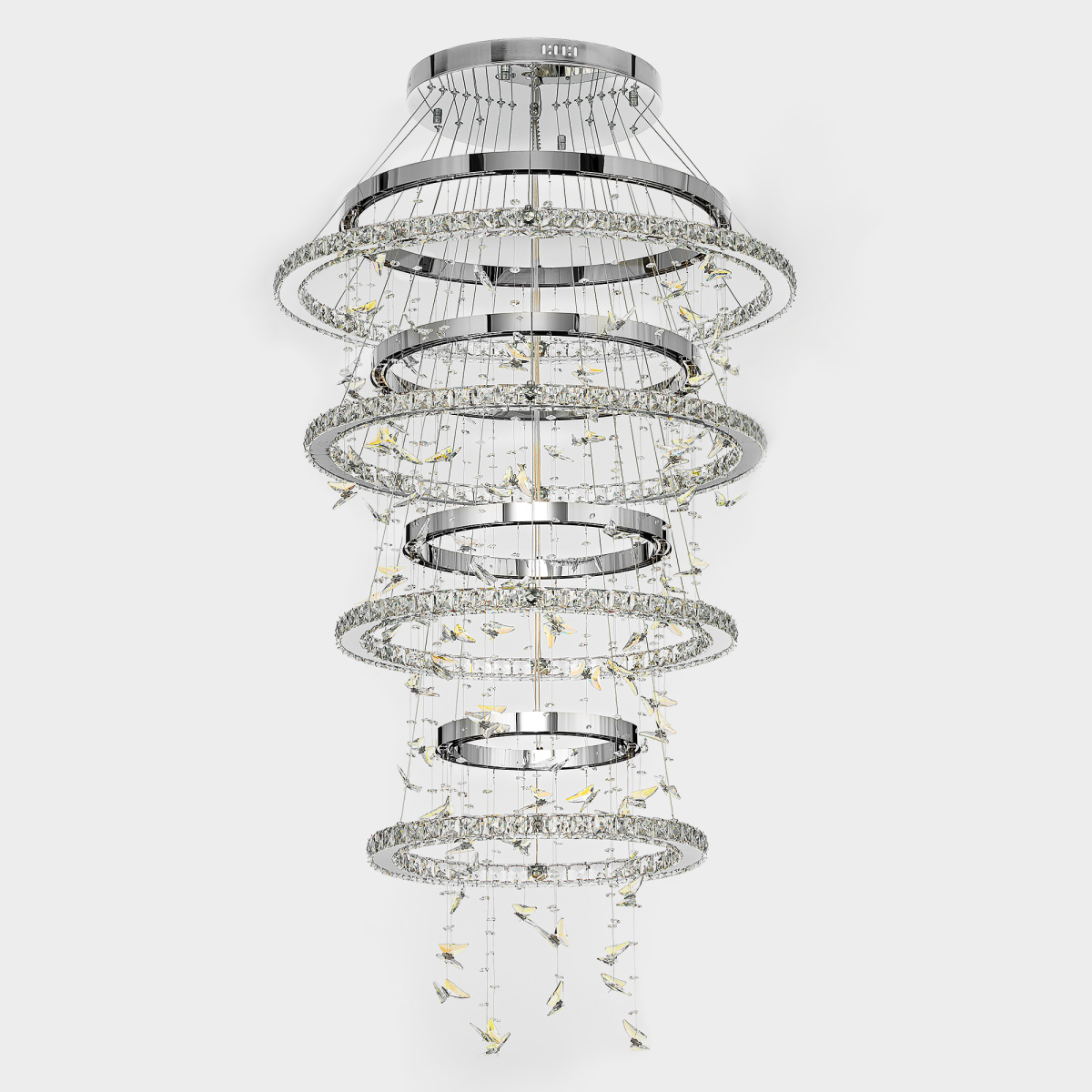 Светодиодная каскадная люстра Citilux ETERA CL322090 словно хрустальный водопад света, ниспадающий с потолка, превращает пространство в волшебный дворец из переливающихся бликов. Восемь подвесных колец из хромированного металла и огранённого хрусталя рассыпают по стенам искристые блики, а изящные подвески в форме бабочек отливают глубокой синевой.