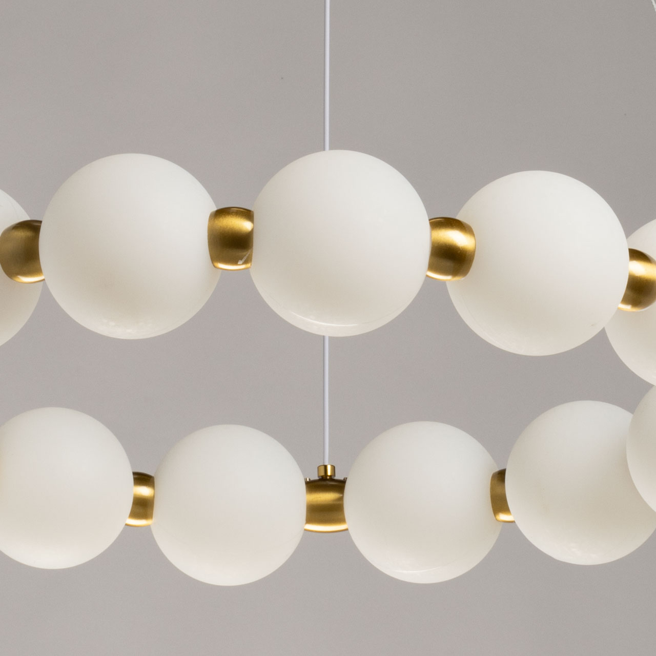 Металлическое основание подвесной люстры гальванизировано в цвет латуни. Светодиодные источники света закрыты плафонами из белого матового акрила.