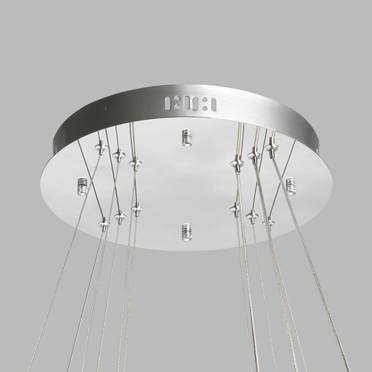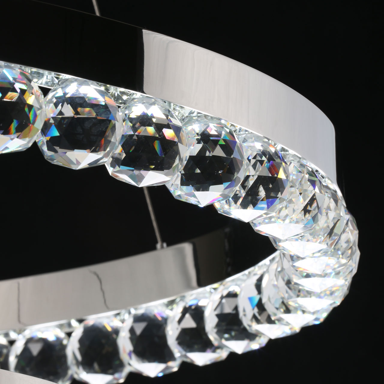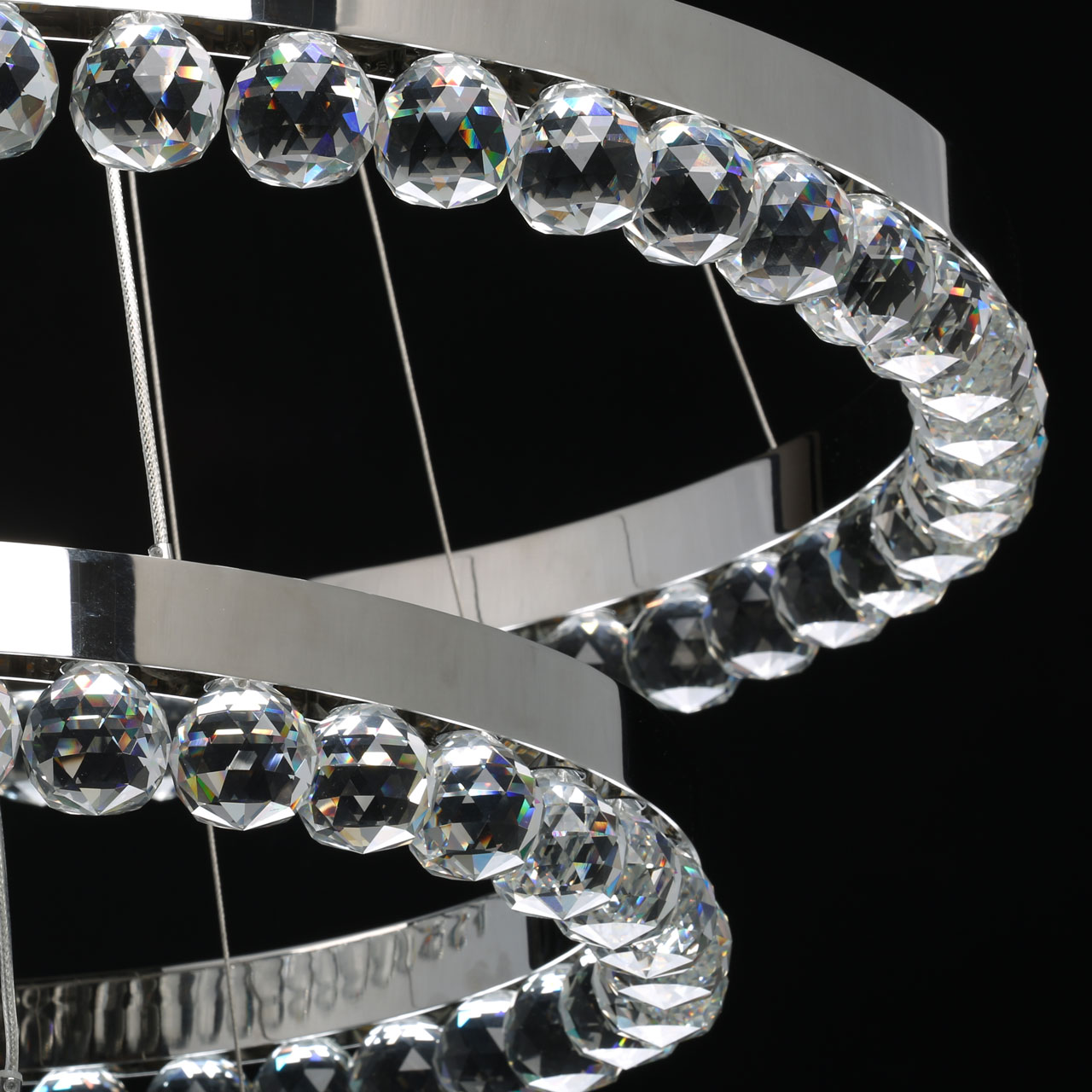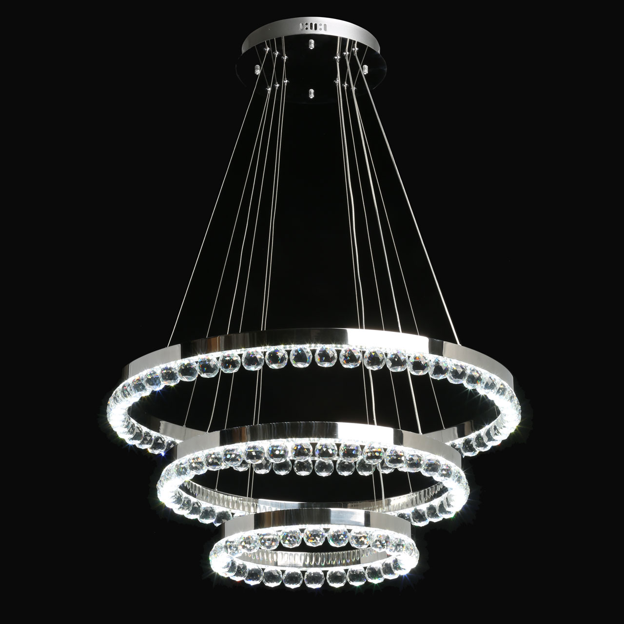 Высокотехнологичный подвесной светильник большой мощности.Люстра рассчитана на большую площадь освещения.Хрусталь высокого качества создает красивую игру света.Возможность изменять дизайн светильника, меняя высоту и наклон колец.Три режима освещения позволяет создать три сценария освещения - теплый, холодный и дневной свет.Пульт дистанционного управления удобен в эксплуатации.