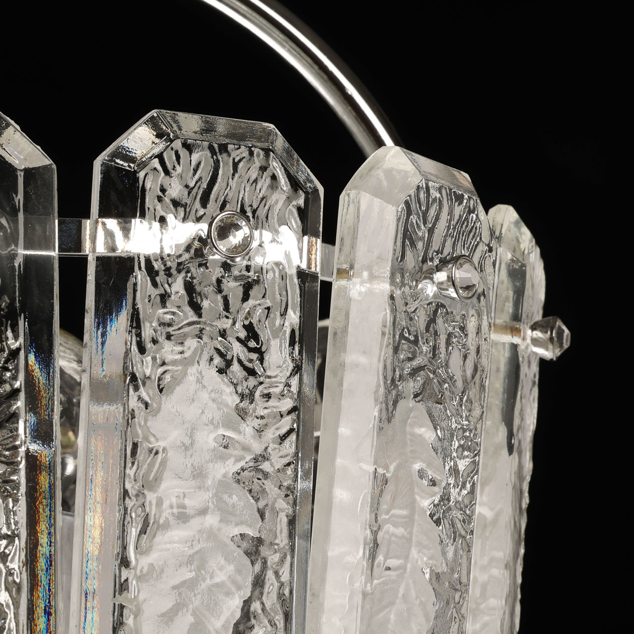 Металлическое основание люстры гальванизировано в цвет хрома. Плафон выполнен из прозрачного фактурного хрустального стекла овальной формы.