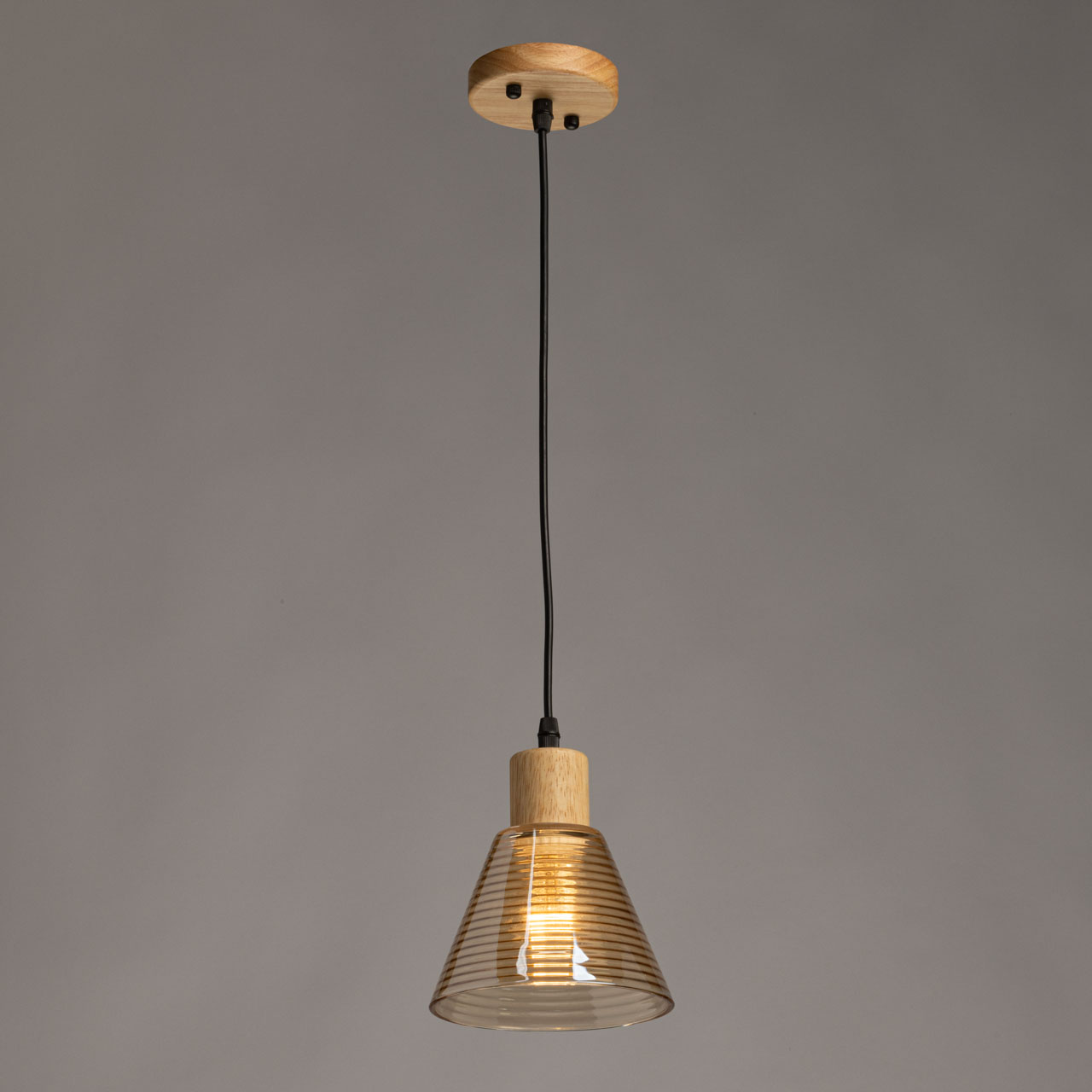 Основание подвеса выполнено из металла с имитацией под натуральное дерево светлого цвета. Стеклянный плафон, гальванизирован в цвет шампань с линейным рисунком отлит в форму.