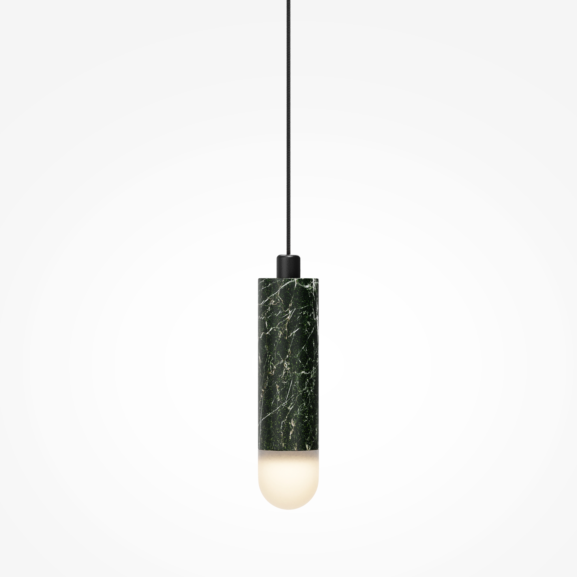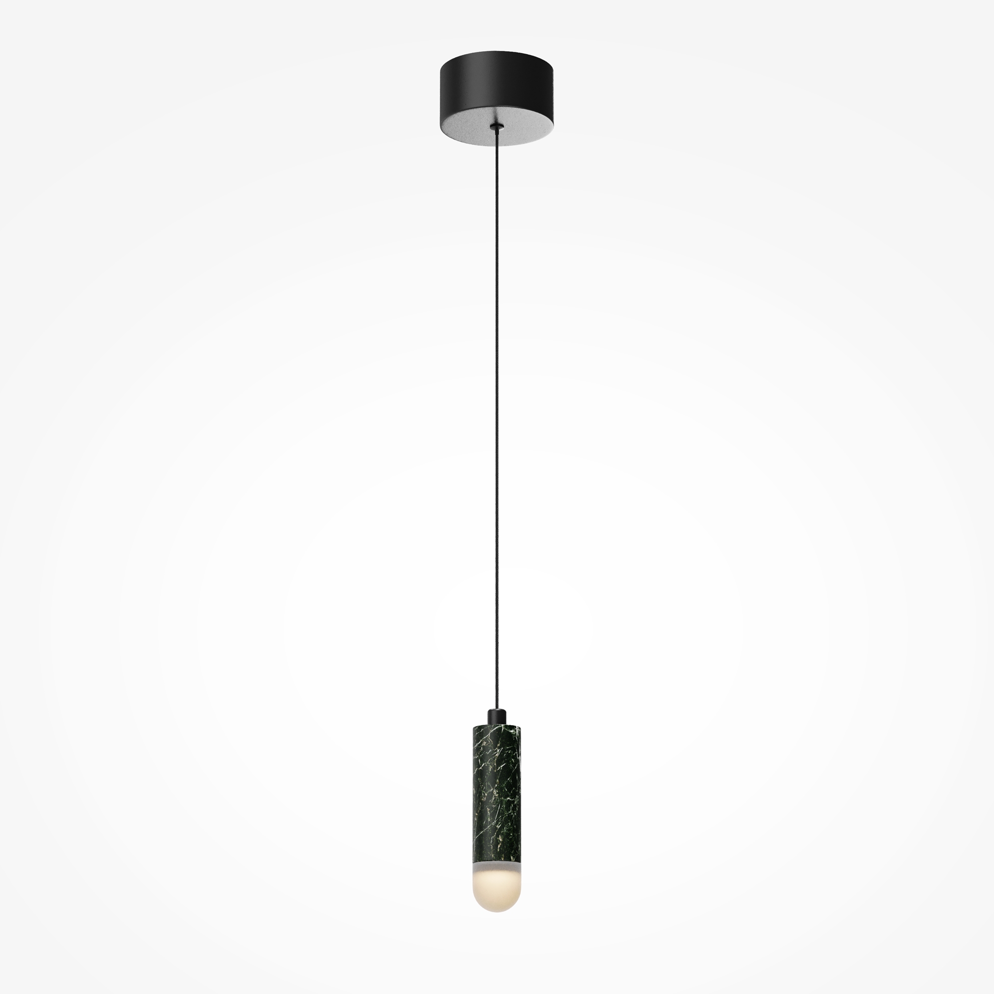 Главный акцент серии — натуральный зелёный мрамор с его неповторимым природным рисунком. Чёрная металлическая арматура создаёт гармоничный контраст. LED-источник с температурой 3000К, скрытый за акриловым рассеивателем, создаёт атмосферную подсветку для деликатного зонирования. В серии представлены подвесы двух форм — конус и вытянутый цилиндр, которые можно использовать как сольные акценты или комбинировать в многоуровневые композиции, меняя длину провода (3000 мм).