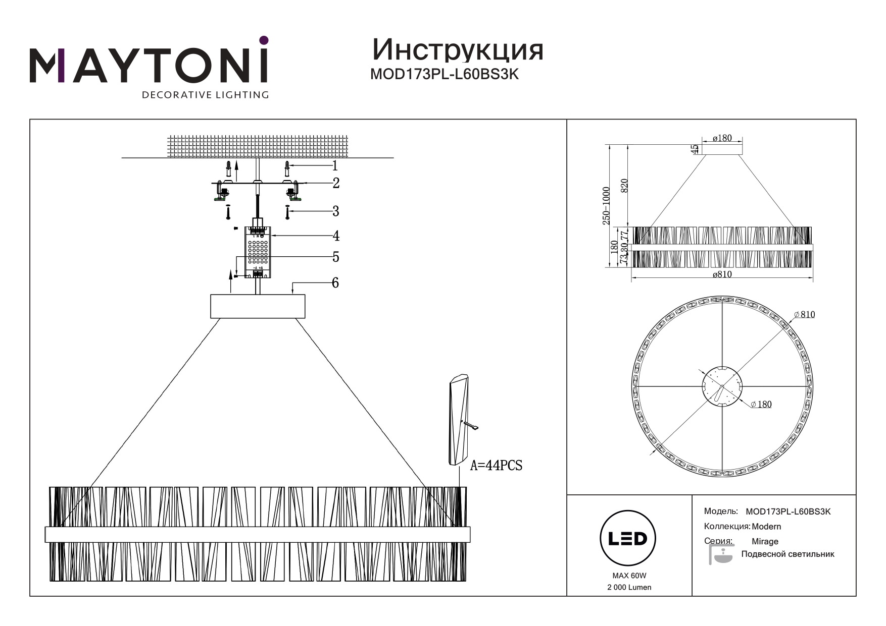 Данную модель MOD173PL-L60BS3K с быстрой доставкой спешите купить по цене 90 490 ₽ в магазине 220svet.ru