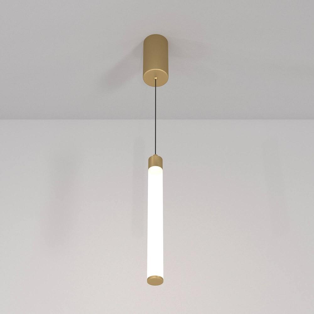 Подвесной светильник выполнен из высококачественных материалов: алюминиевого каркаса в золотом цвете и белого плафона цилиндрической формы. Благодаря своей компактности и размерам 30 мм х 506 мм, модель идеально впишется в любой интерьер и добавит изысканности вашему пространству. Тип подвеса трос.
