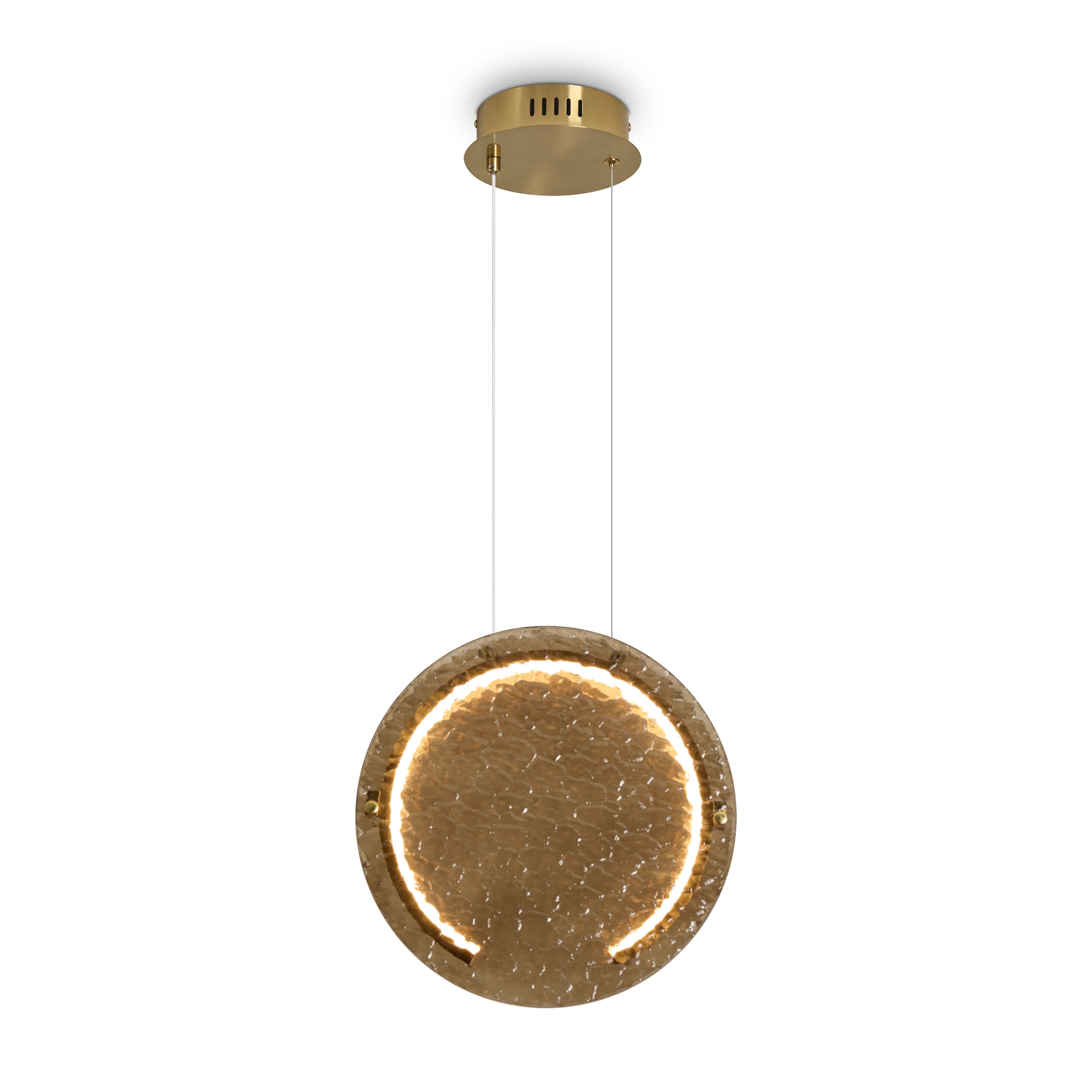 Стеклянные подвесные светильники Lunar с рельефным стеклом в двух цветовых вариантах: коньячном, белом матовым и прозрачным. Две формы плафонов: горизонтальный вытянутый и круглый, напоминающий очертания луны. Арматура — металл латунного цвета. Источник света - LED 3000 K. Дизайн сочетает современные формы с традиционными материалами, создавая эффектное освещение. Рельефное стекло добавляет интересную игру света и тени.