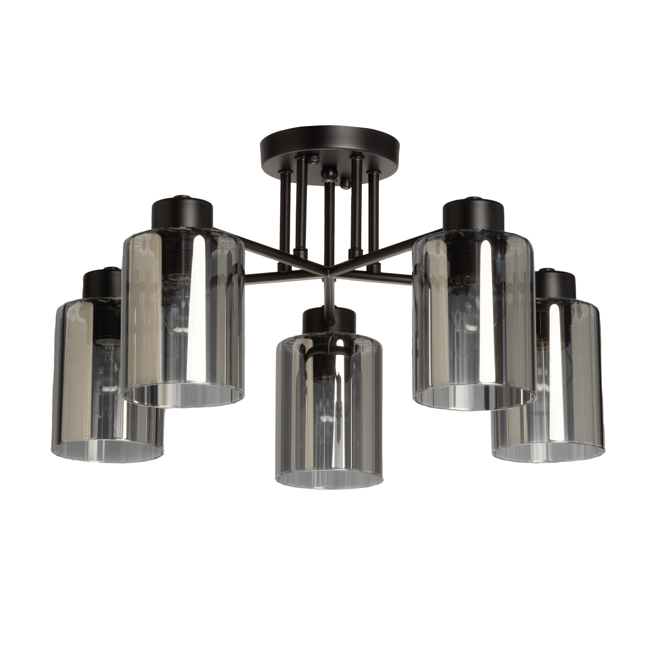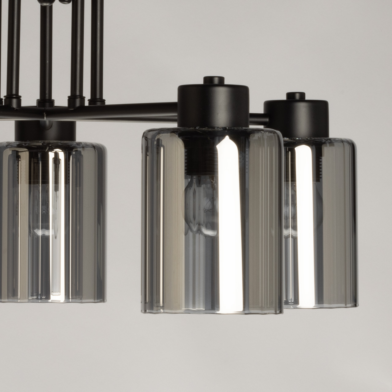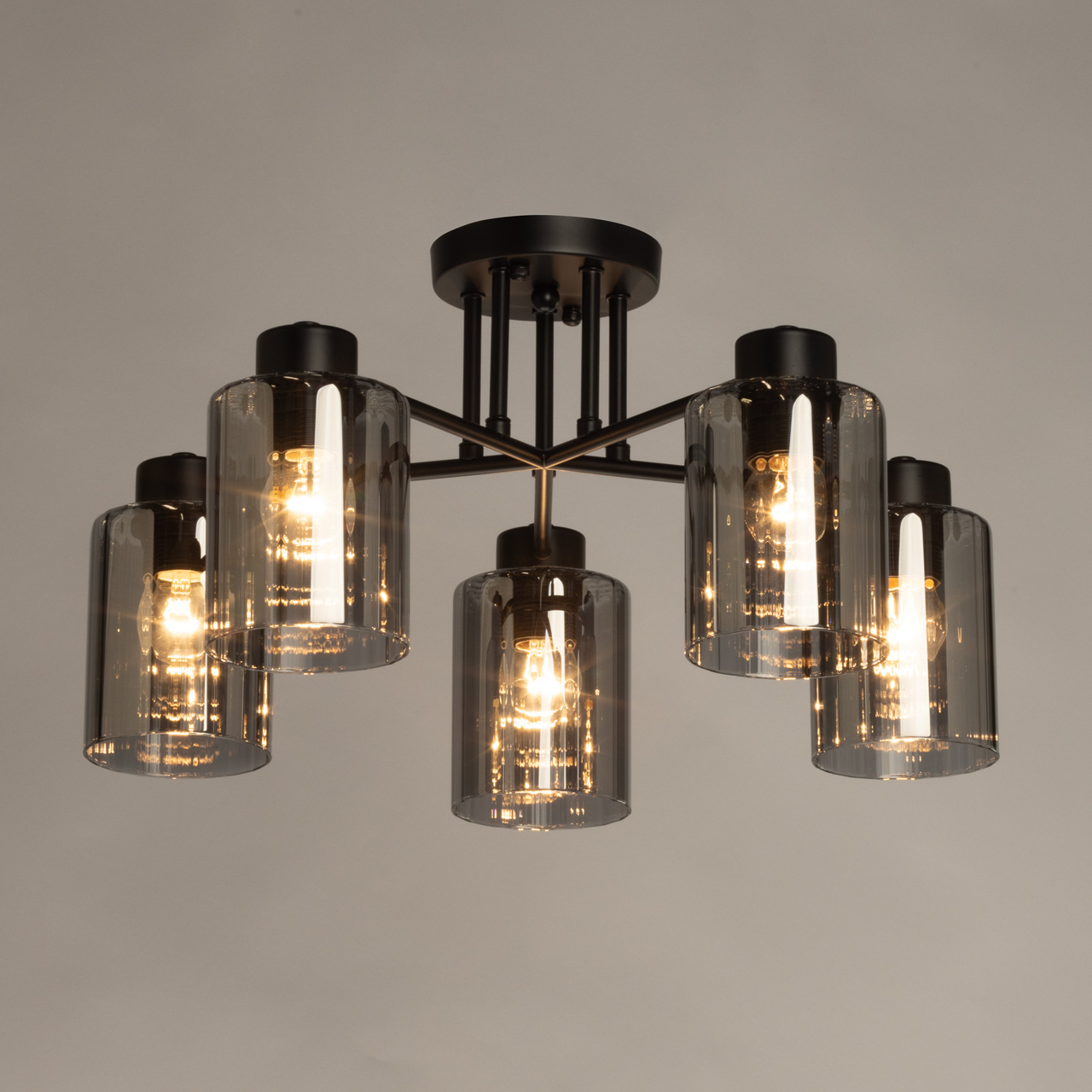 Элегантная потолочная люстра, выполненная в индустриальном стиле, станет стильным и функциональным дополнением любого интерьера. Её конструкция представляет собой пять изящных рожков из матового чёрного металла. Каждый рожок венчает цилиндрический плафон из дымчатого стекла, создающего мягкое, рассеянное освещение. Дымчатый оттенок стекла придает свету особую глубину и теплоту, прекрасно гармонируя с металлическим каркасом. Такая комбинация материалов создает интересный контраст текстур, что позволяет люстре эффектно смотреться как в классическом, так и в современном интерьере. Минимальная высота люстры составляет всего 24,5 см, что делает её подходящей для помещений с невысокими потолками.
