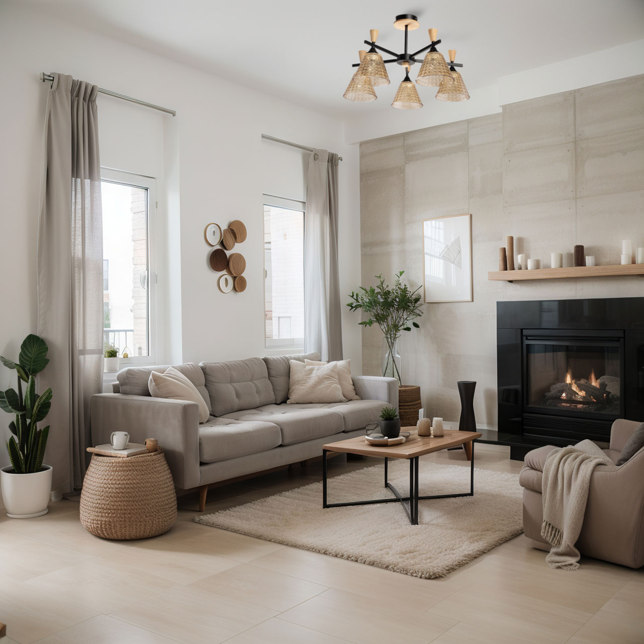 Металлическое основание потолочной люстры окрашено в черный цвет. Стеклянные плафоны отлиты в сложную форму и гальванизированы в цвет шампань. Светильник декорирован элементами из натурального светлого дерева.