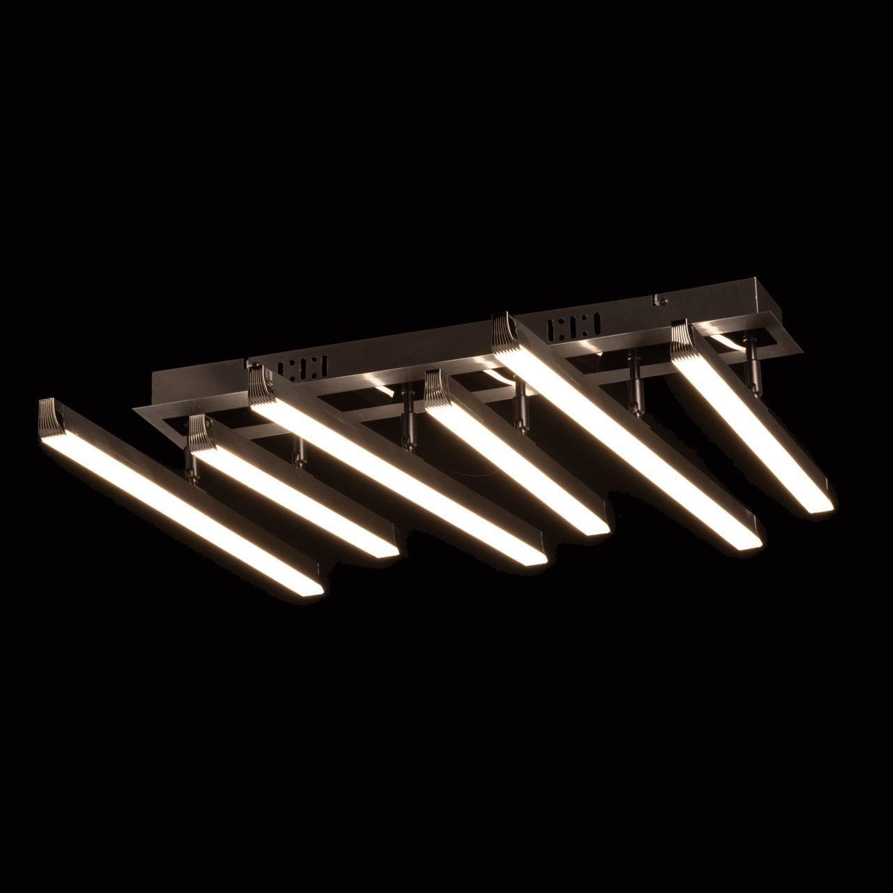 Металлическое основание потолочной люстры окрашено в цвет графита. Светодиодные источники свет закрыты белым акрилом.