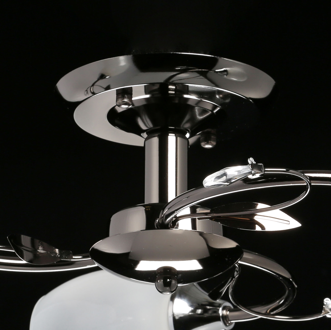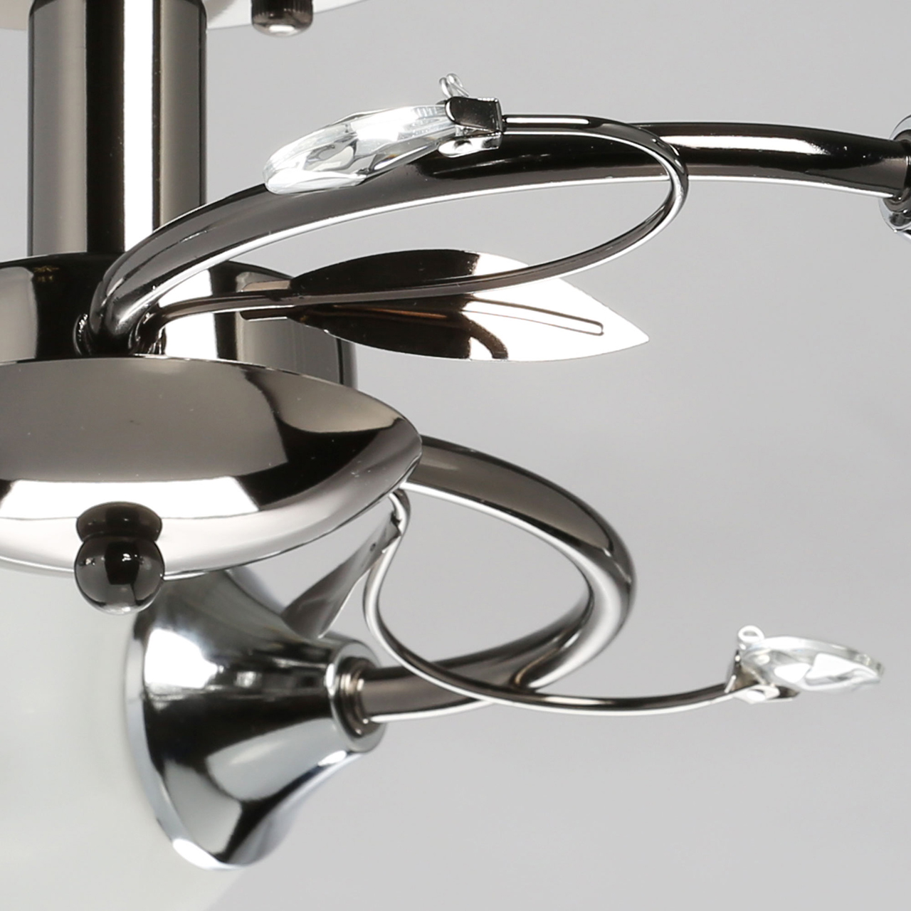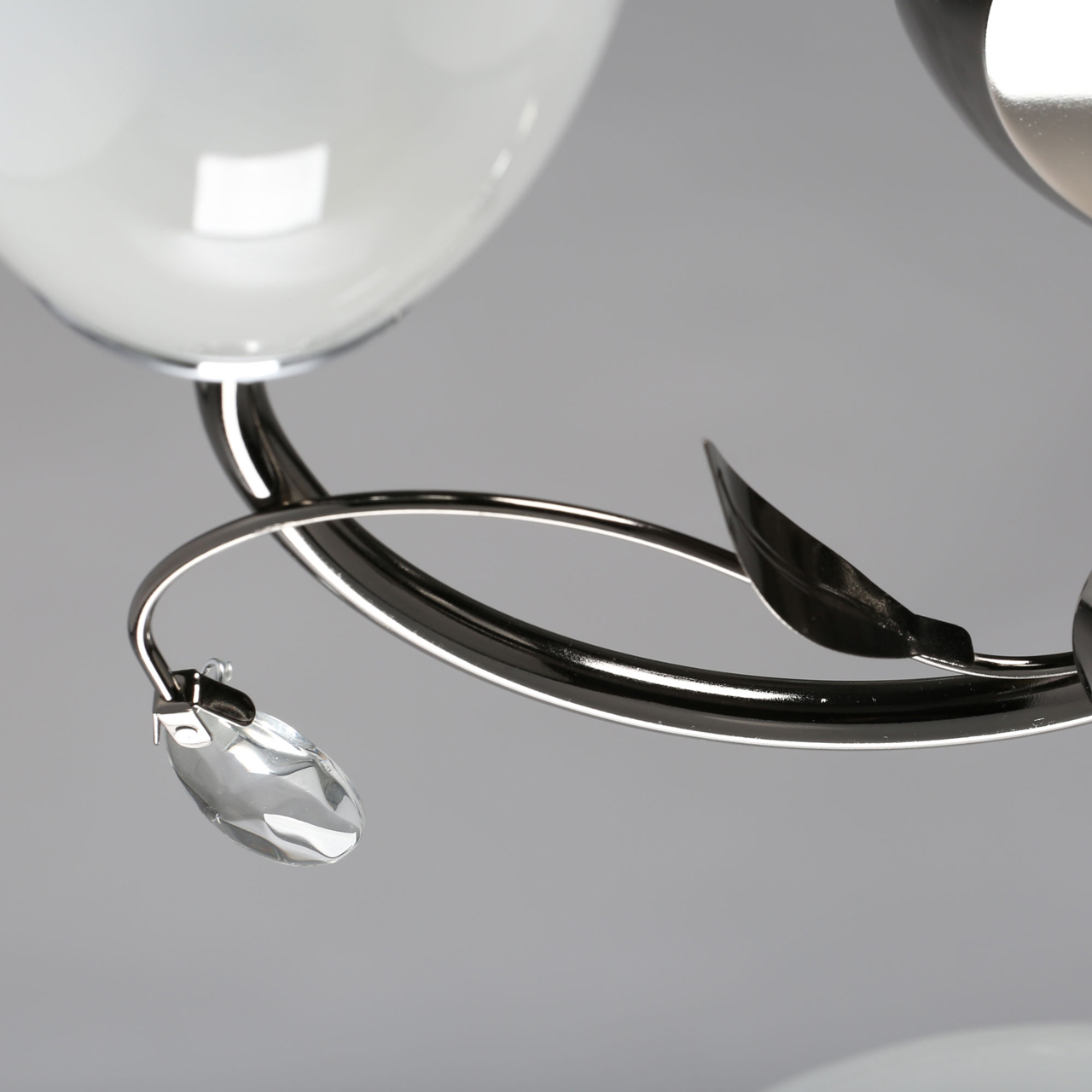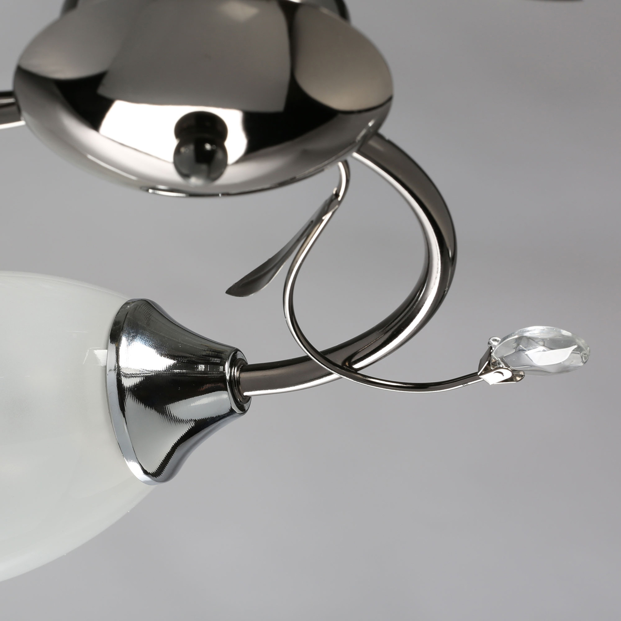 Основание светильника выполнено из металла, гальванизация в цвет никеля. Потолочная чаша, корпус, держатели плафонов изготовлены по технологии токарной обработки, рожки и завитки - прокат на роликовом станке.Светильник декорирован стеклянными плафонами, отлитыми в форму, с последующим матированием внутренней поверхности.Декоративные элементы на завитках из декоративного стекла в форме миндаля.