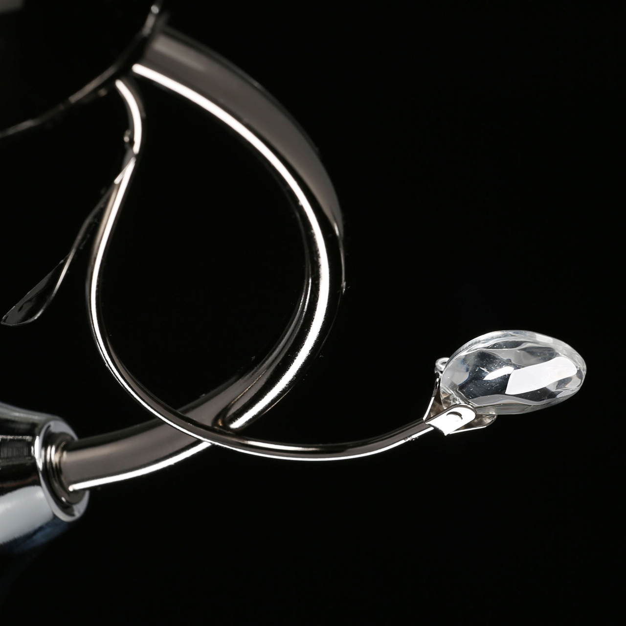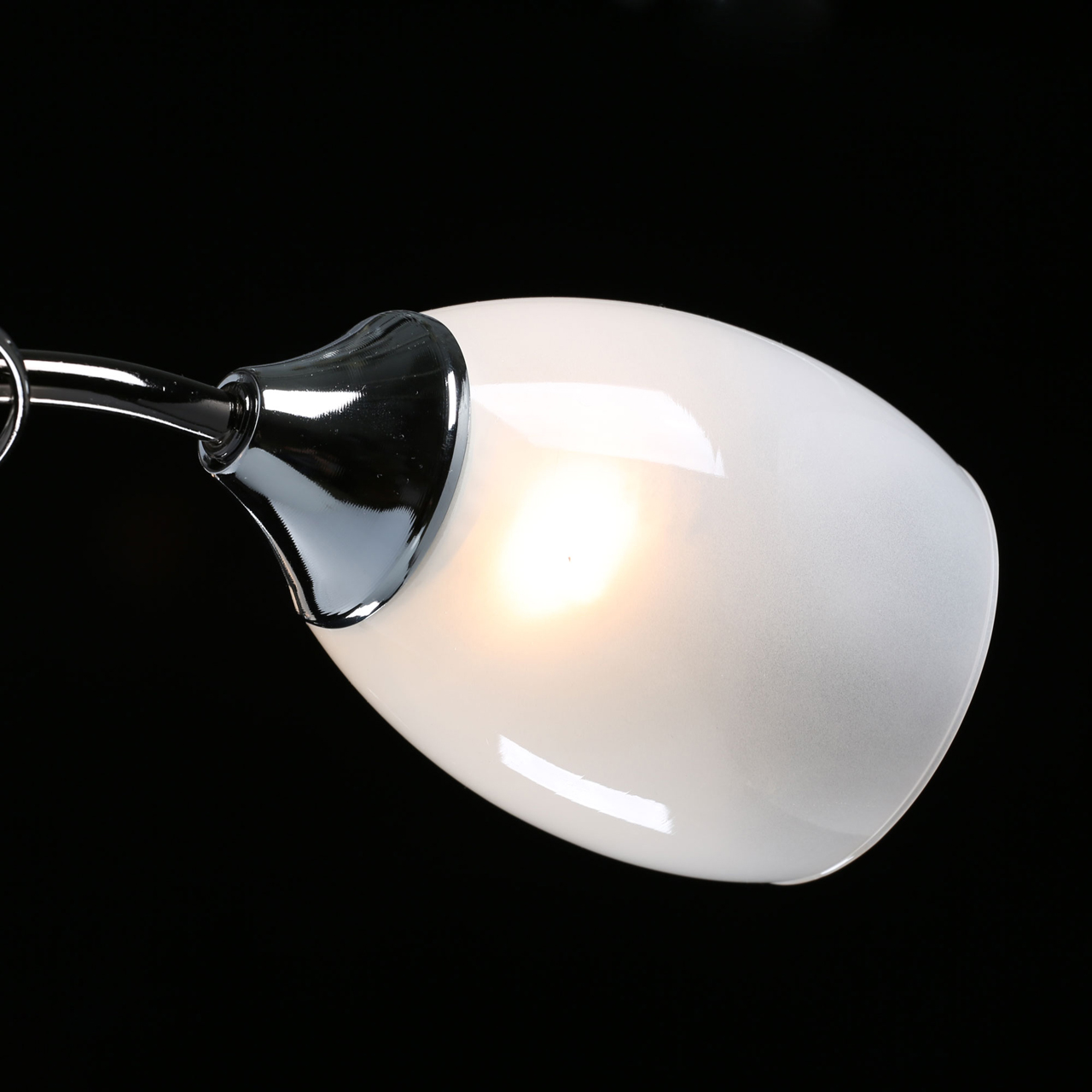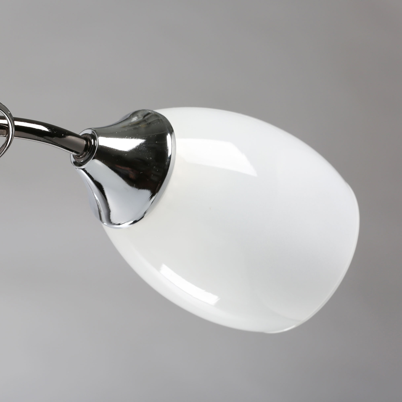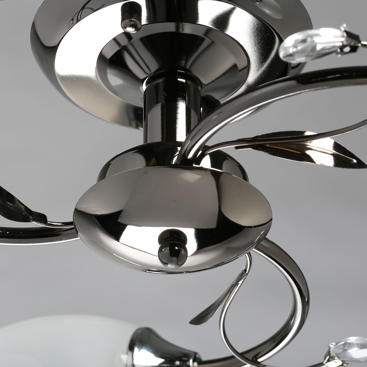 Основание светильника выполнено из металла, гальванизация в цвет никеля. Потолочная чаша, корпус, держатели плафонов изготовлены по технологии токарной обработки, рожки и завитки - прокат на роликовом станке.Светильник декорирован стеклянными плафонами, отлитыми в форму, с последующим матированием внутренней поверхности.Декоративные элементы на завитках из декоративного стекла в форме миндаля.