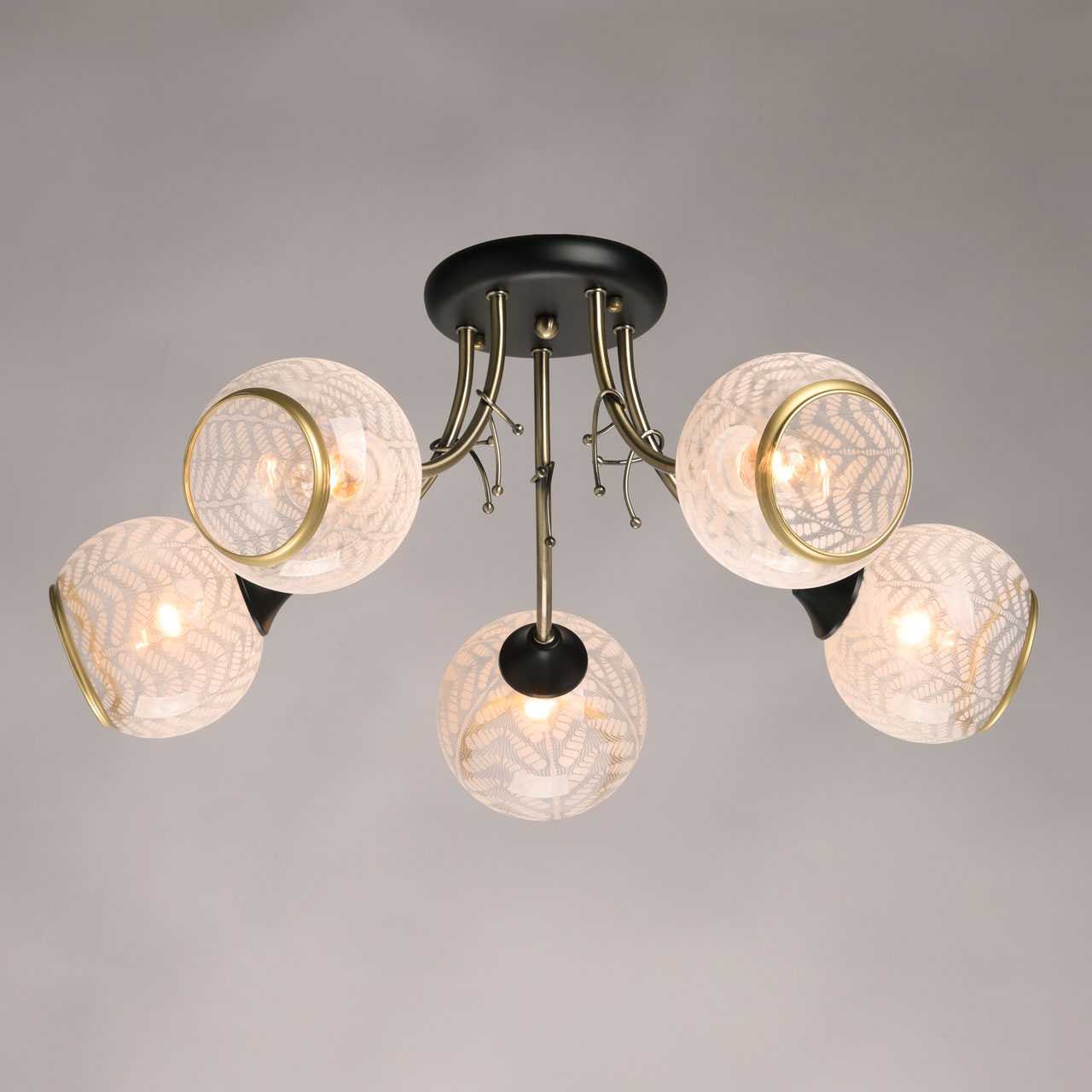 Металлическое основание подвесной люстры гальванизировано в цвет латуни. Отдельные элементы основания окрашены в черный цвет. Плафоны отлиты вручную и матированы по трафарету в растительный мотив. Края плафонов отделаны кантом цвета латуни.