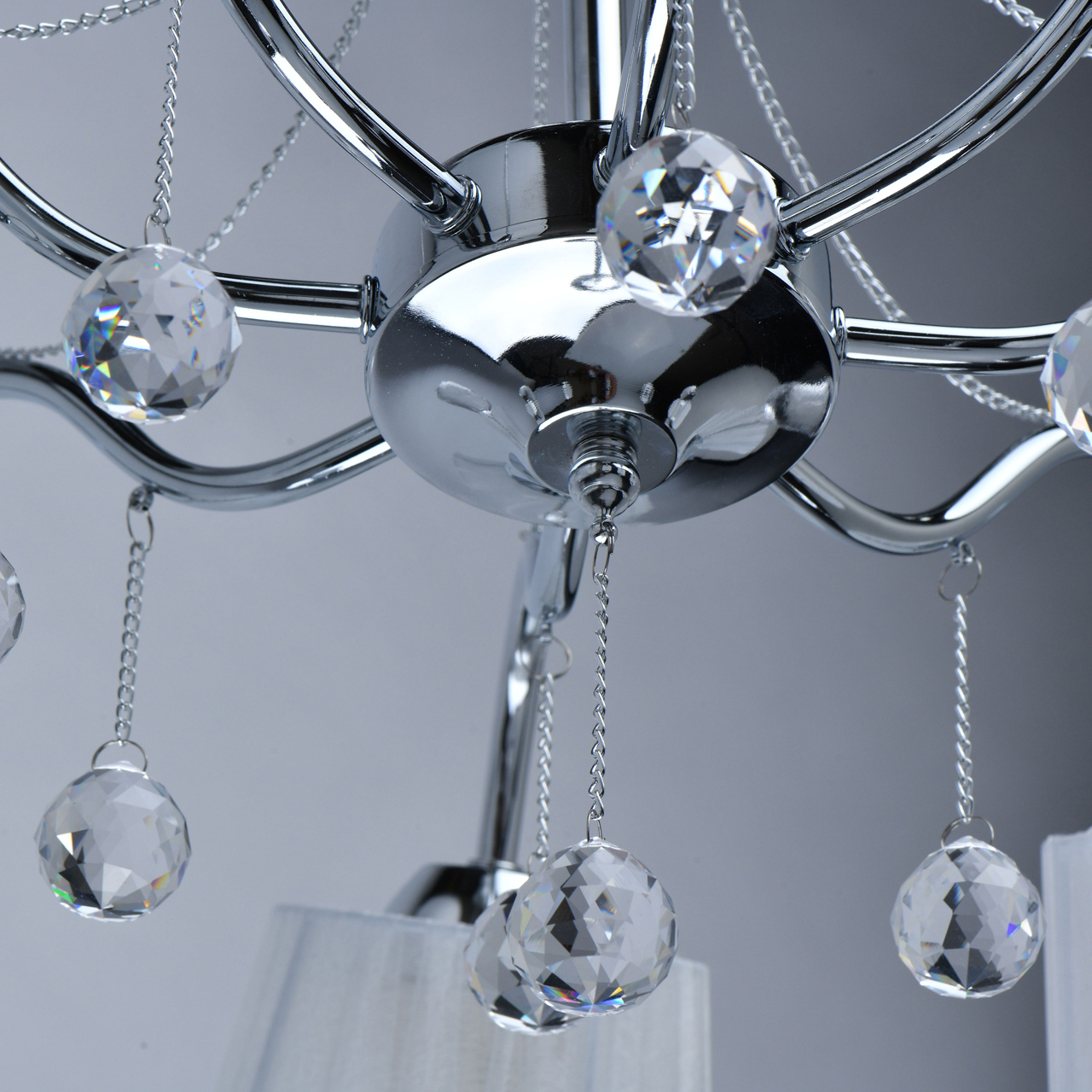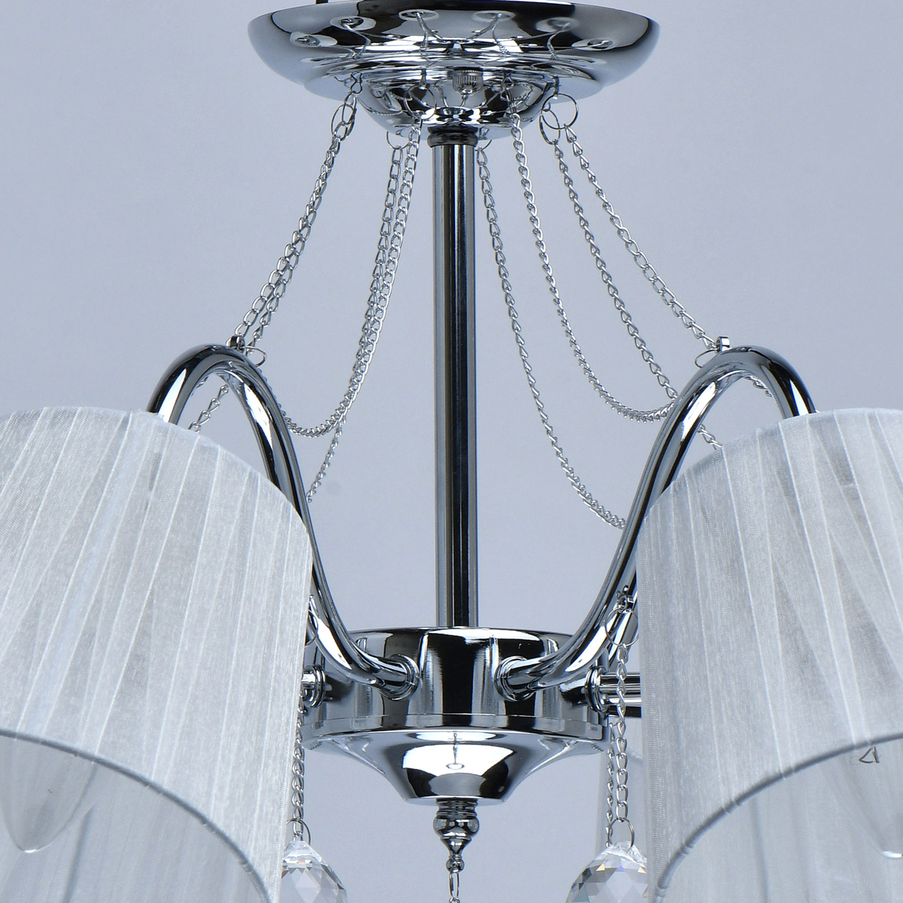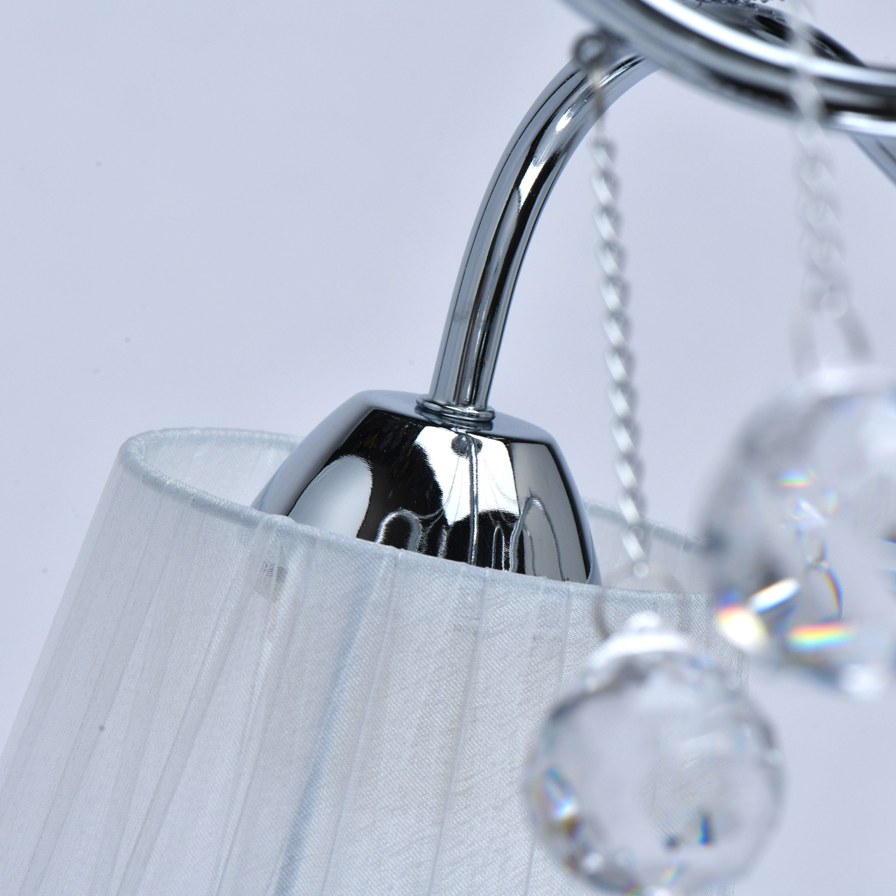 Основание светильника выполнено из сплава металла и гальванизировано в цвет хрома. Абажуры из прозрачной органзы белого цвета с термостойким акрилом внутри. Абажуры отделаны кантом сверху и снизу, прошиты. Светильник декорирован металлическими цепочками в цвет основания и прозрачным хрусталем в форме шара.