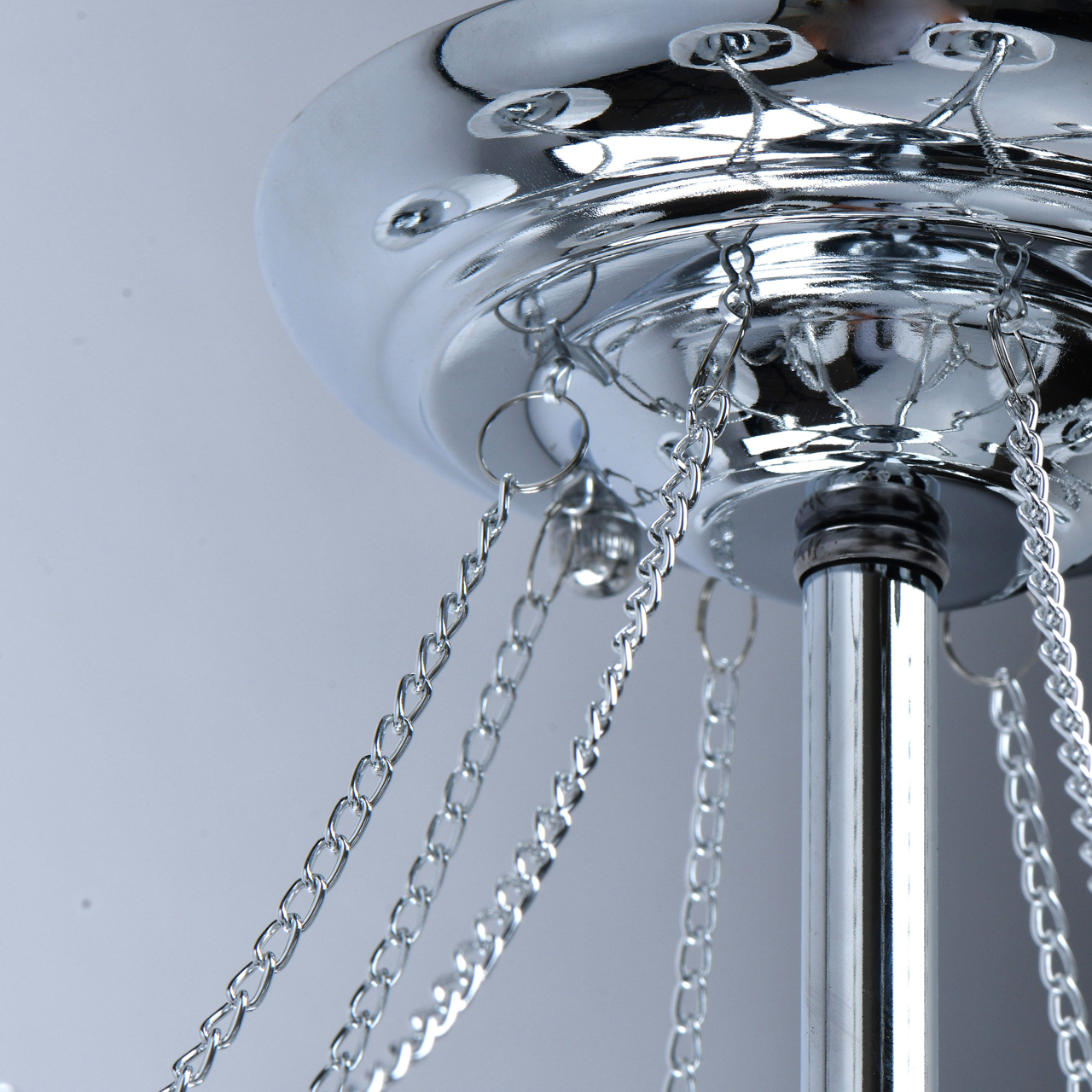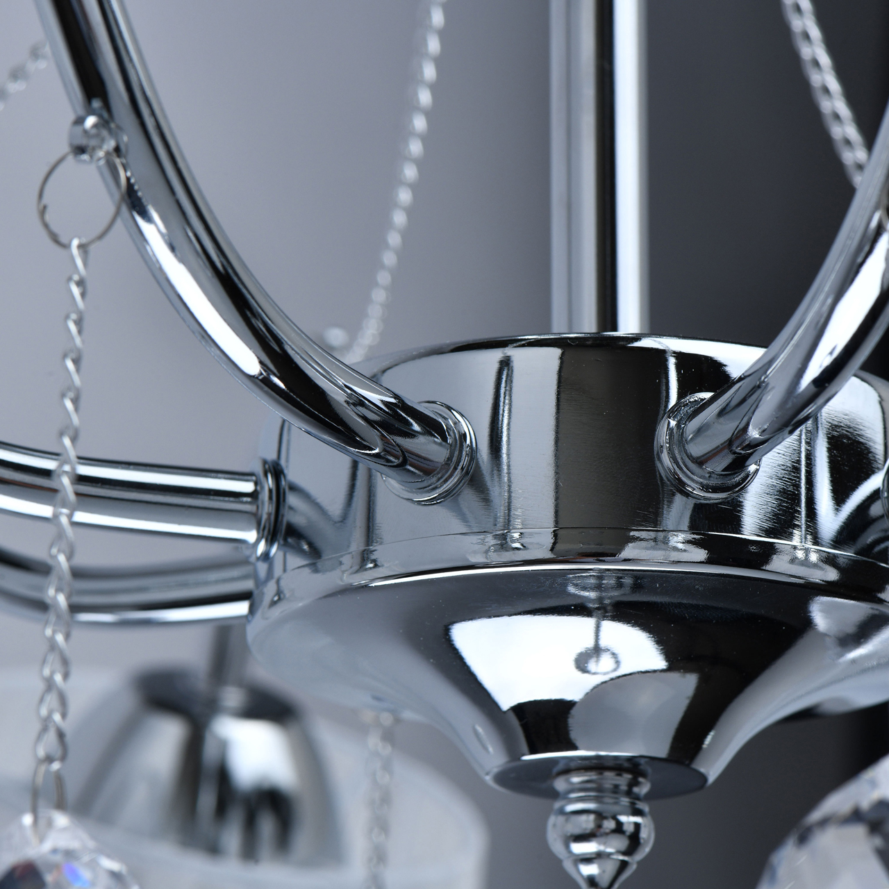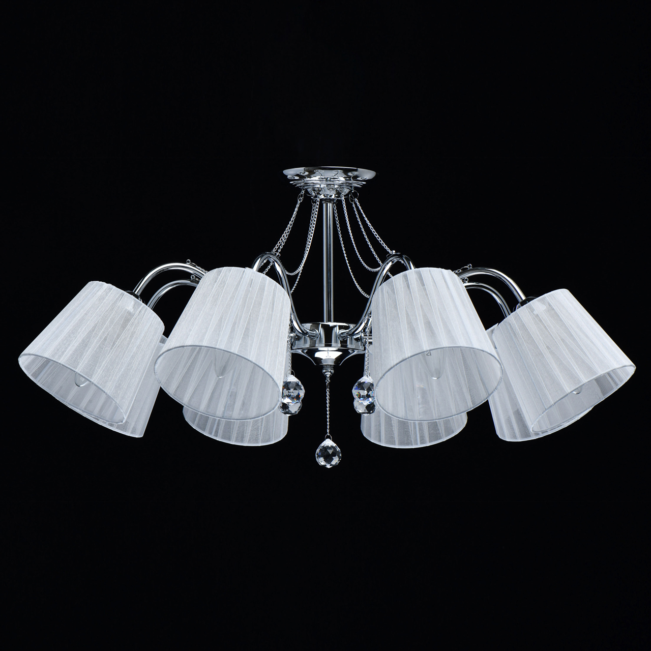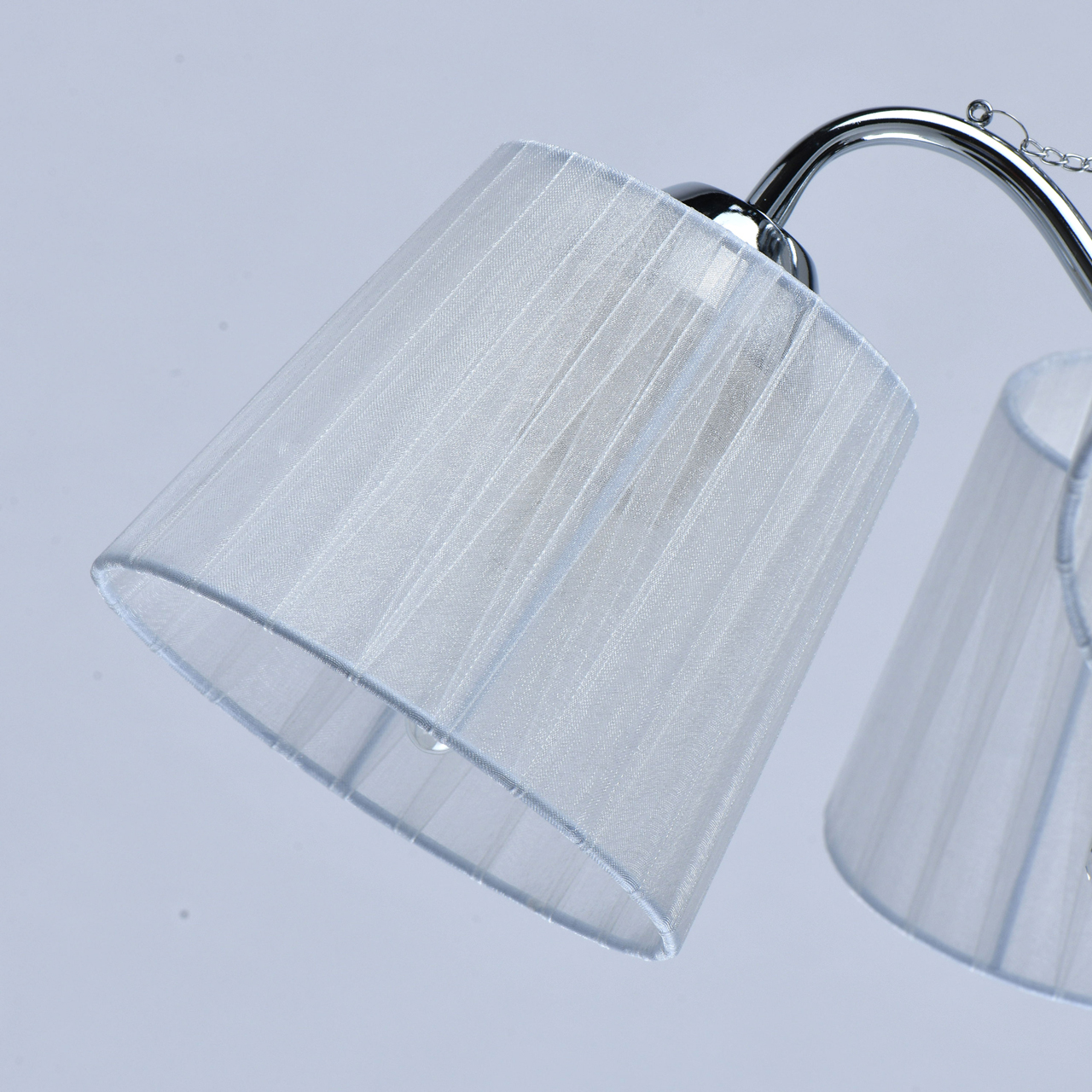 Основание светильника выполнено из сплава металла и гальванизировано в цвет хрома. Абажуры из прозрачной органзы белого цвета с термостойким акрилом внутри. Абажуры отделаны кантом сверху и снизу, прошиты. Светильник декорирован металлическими цепочками в цвет основания и прозрачным хрусталем в форме шара.