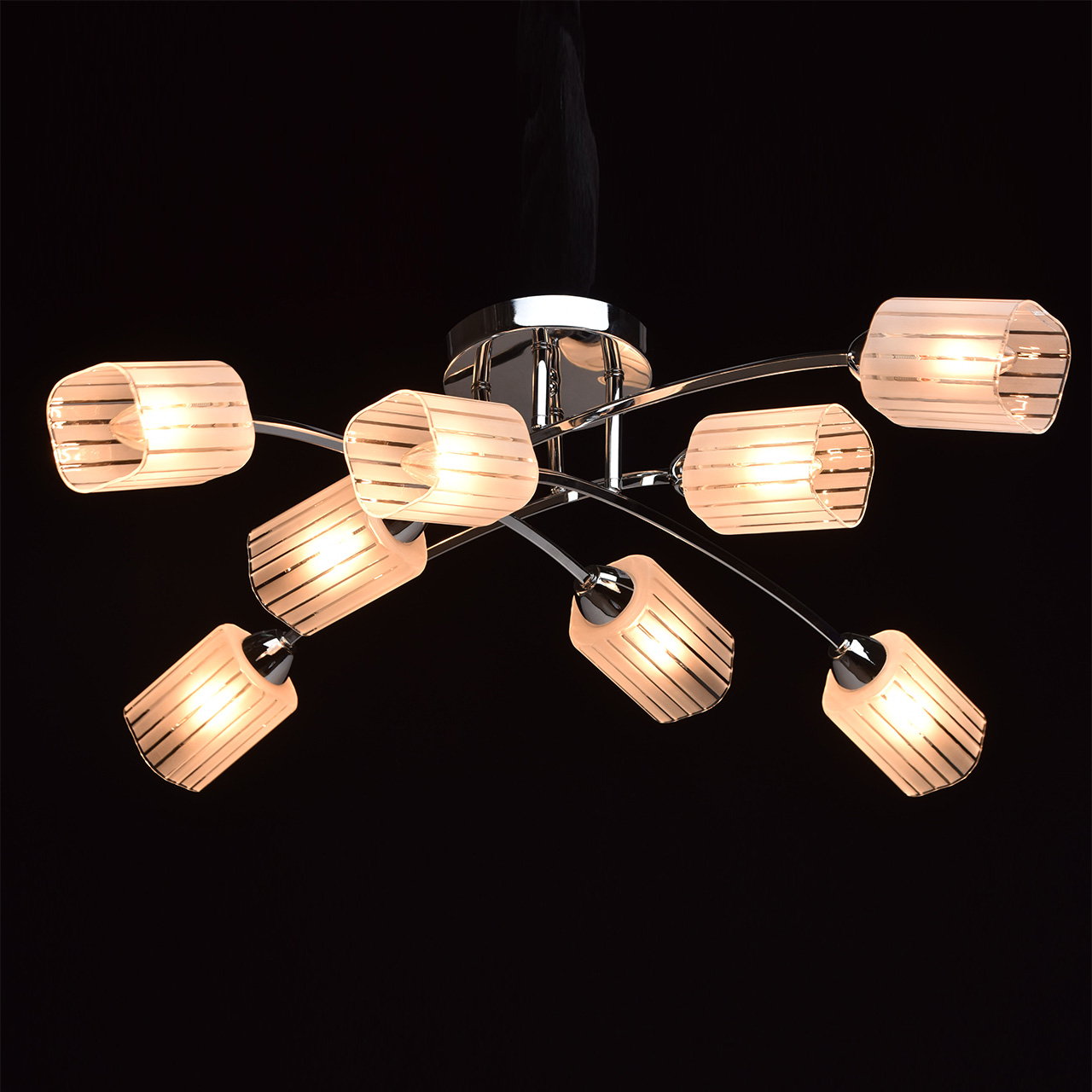 Потолочный светильник рассчитан на 8 лампочек с цоколем E14, что обеспечивает равномерное освещение большого пространства. Подойдут как матовые, так и прозрачные лампочки формы «свеча»: они оптимальны для узких стеклянных плафонов. Рекомендуемая мощность ламп – 60 Вт.