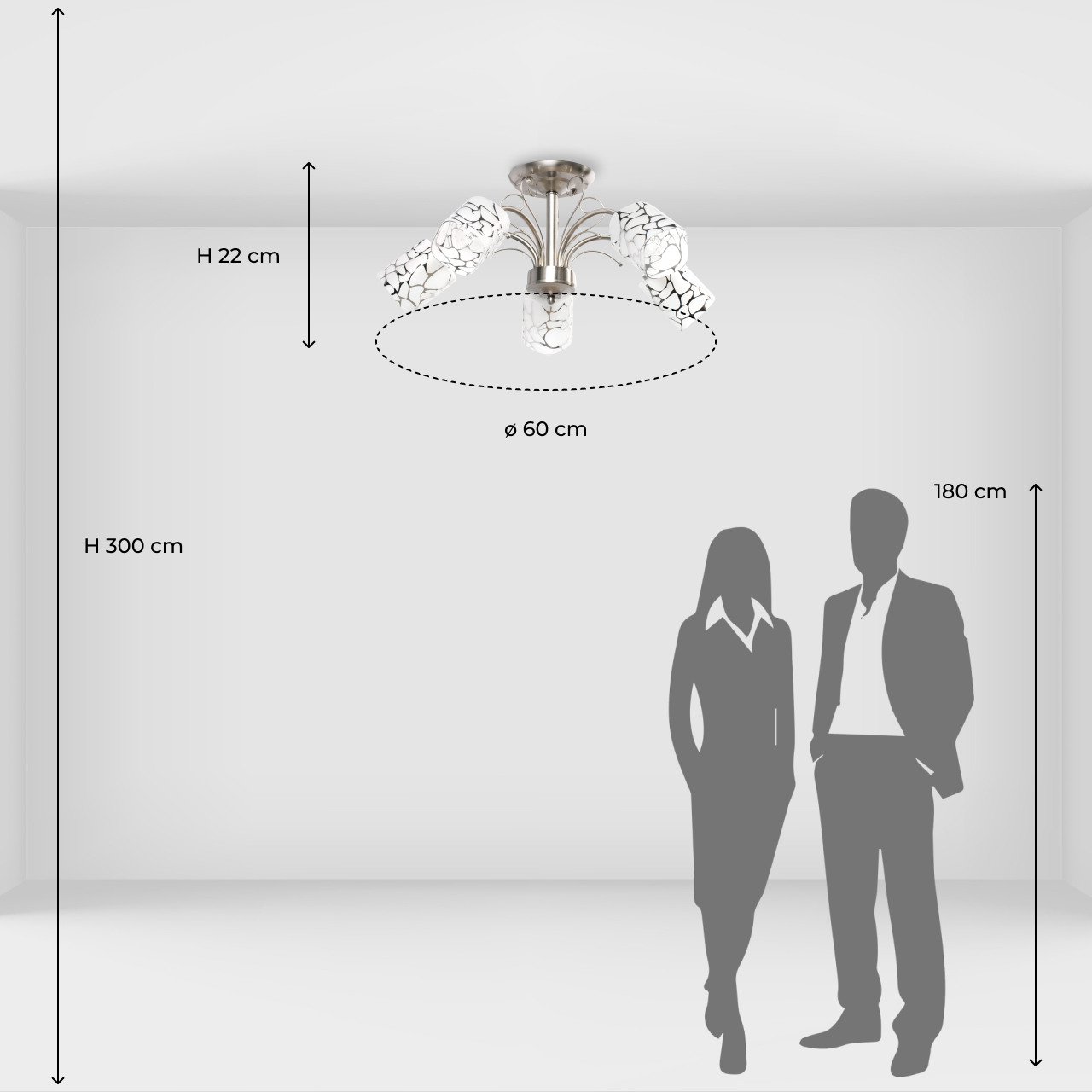 Основание светильника выполнено из металла и гальванизировано в цвет матового хрома. Потолочная чаша, корпус и держатели плафонов изготовлены по технологии обработки на токарном станке, рожки и завитки изогнуты по технологии проката на роликовом станке.Светильник декорирован стеклянными плафонами, матированными, с последующей гальванизацией по трафарету в цвет хрома.