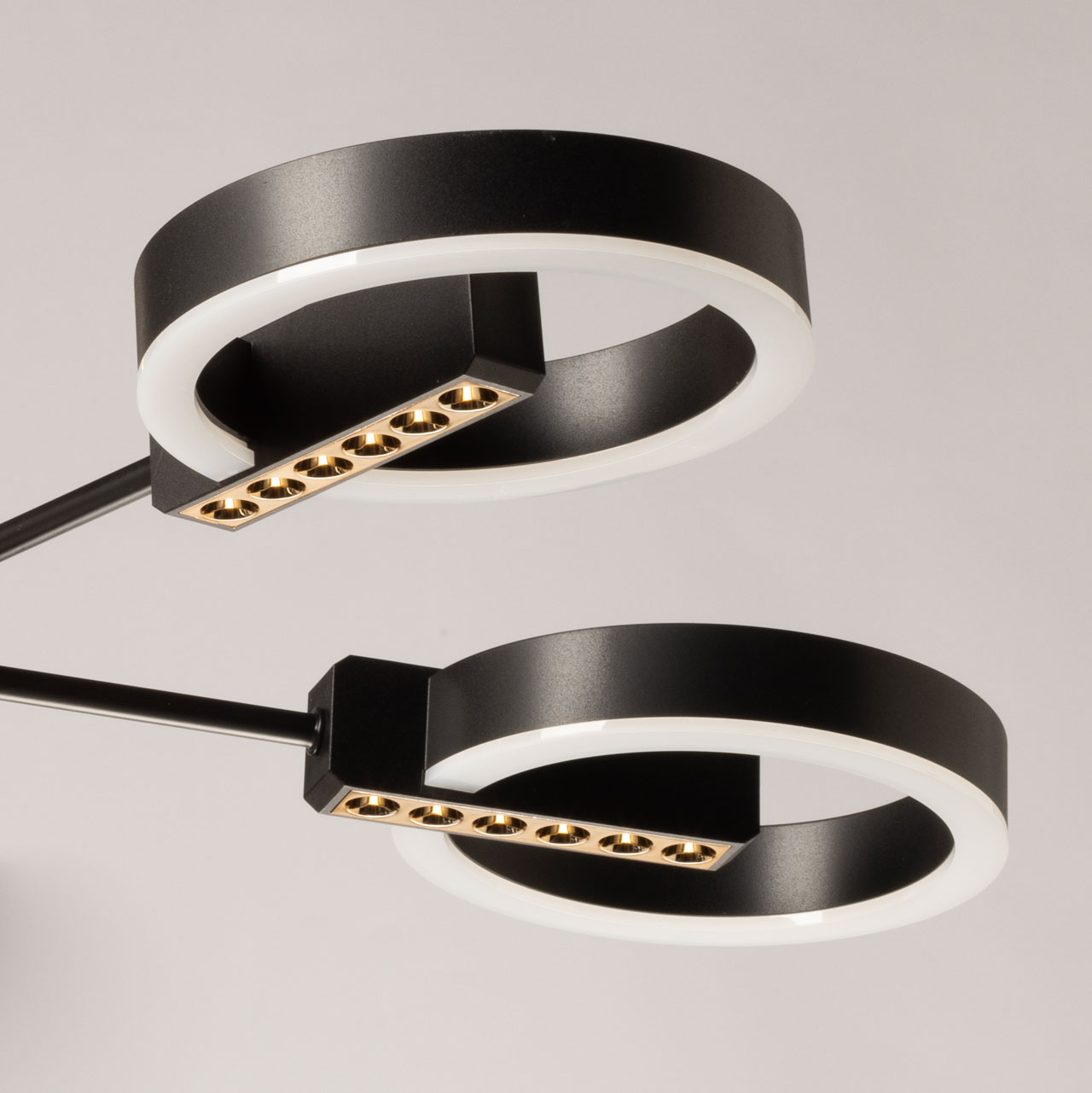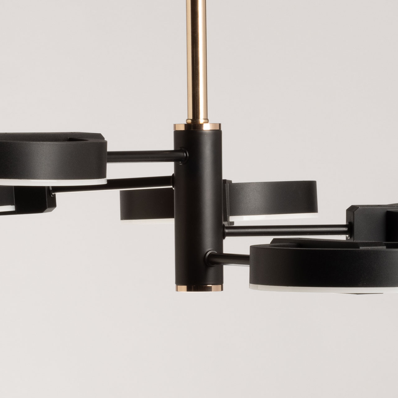 Металлическое основание подвесной люстры окрашено в черный цвет. Отдельные элементы основания гальванизированы в цвет золота. Корпус плафонов выполнен из сплава алюминия и окрашен в цвет основания. Светодиодные источники декоративного света закрыты матовым акрилом. Открытые функциональные точечные светодиоды углублены в корпус плафонов.
