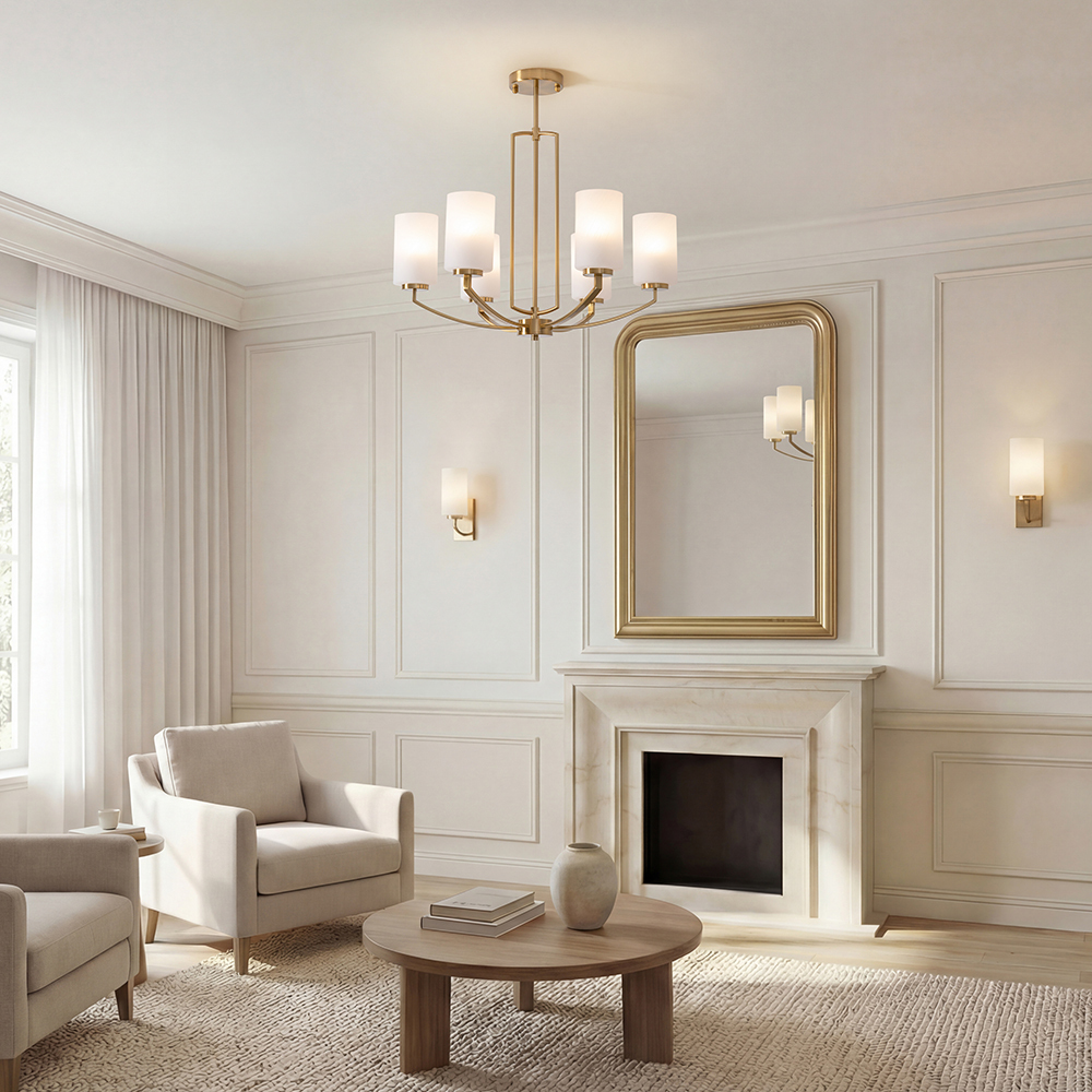 Арматура — металл, латунь. Стеклянные белые абажуры рассеивают свет. Центральное основание создаёт воздушность конструкции. Лампы E14 (5/6 шт., не в комплекте).