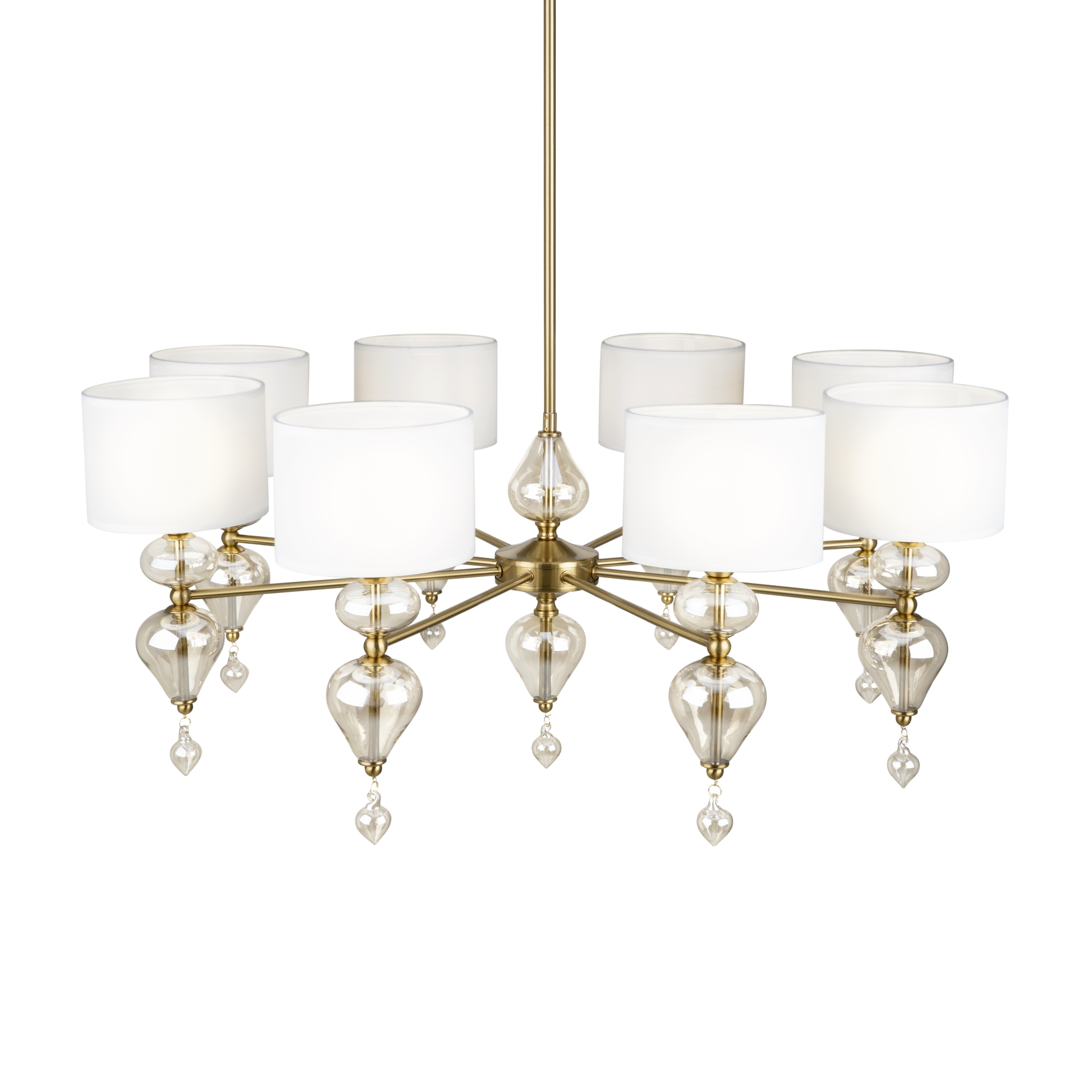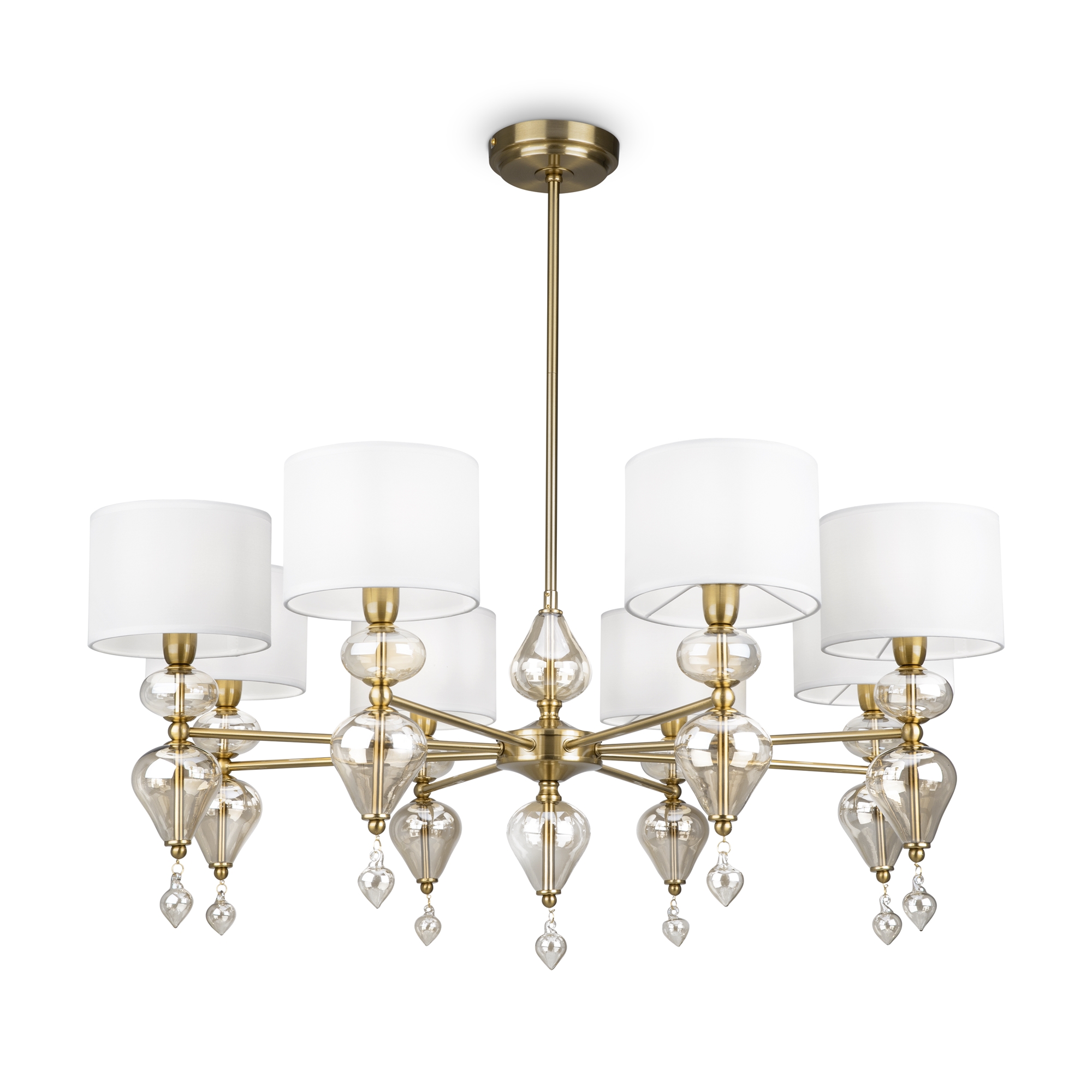 Изумительная модель FR5369CL-08BS от немецкого производителя Freya относится к коллекции Raise ,металлическая конструкция декорирована выдувными стеклянными элементами окрашена в цвет латуни , материал абажуров тканевый -молочного цвета. Источником света служит лампа с цоколем Е14 и площадью освещения 18 кв.м. Данную модель можете купить в интернет-магазине 220svet.ru