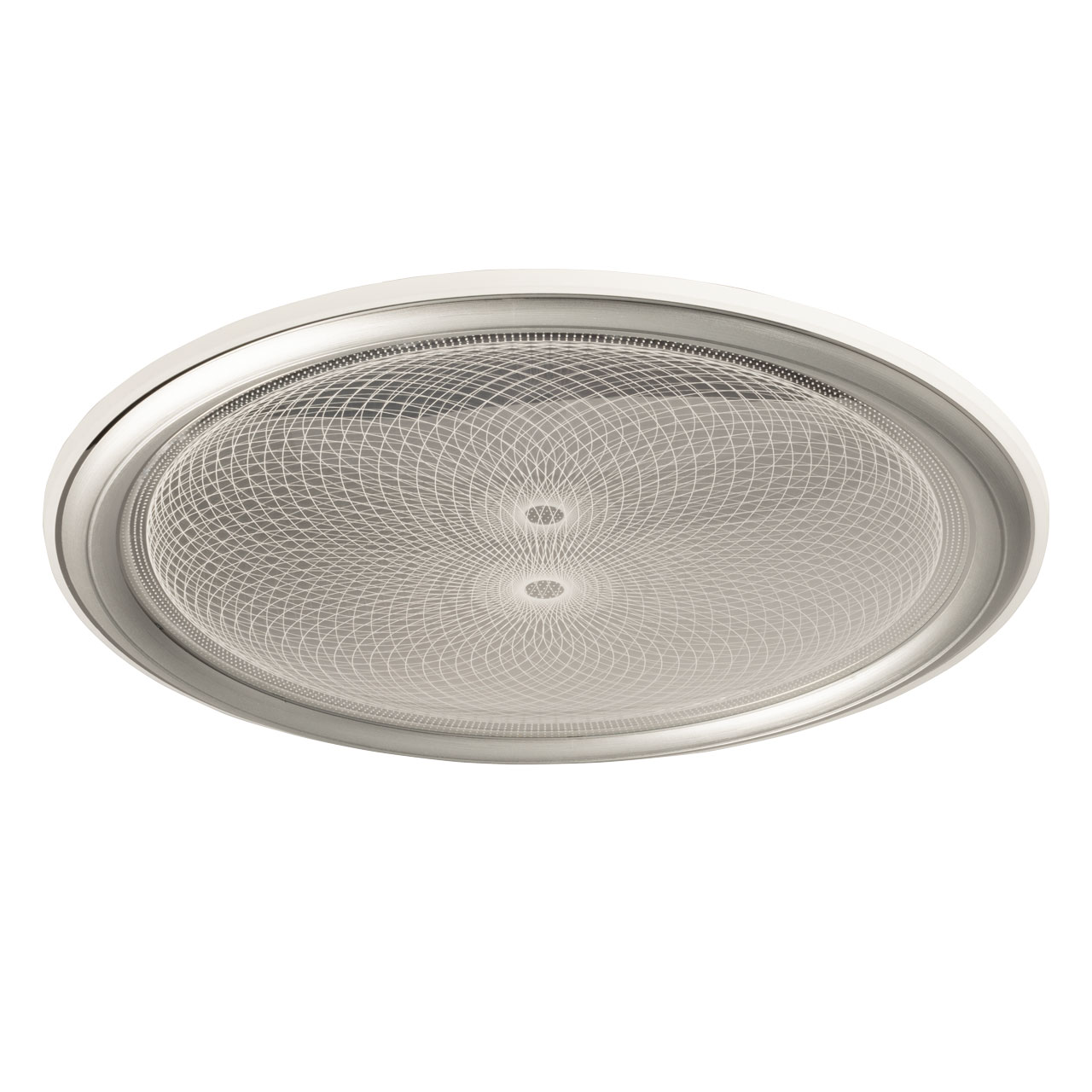 Металлическое основание светильника окрашено в белый цвет. Плафон выполнен из сплава алюминия с цинком и окрашен в цвет серебра. Светодиодные источники света закрыты белым матовым акрилом. Потолочная люстра декорирована металлической пластиной, гальванизированной в цвет хрома и прозрачным акрилом с 3D-эффектом.